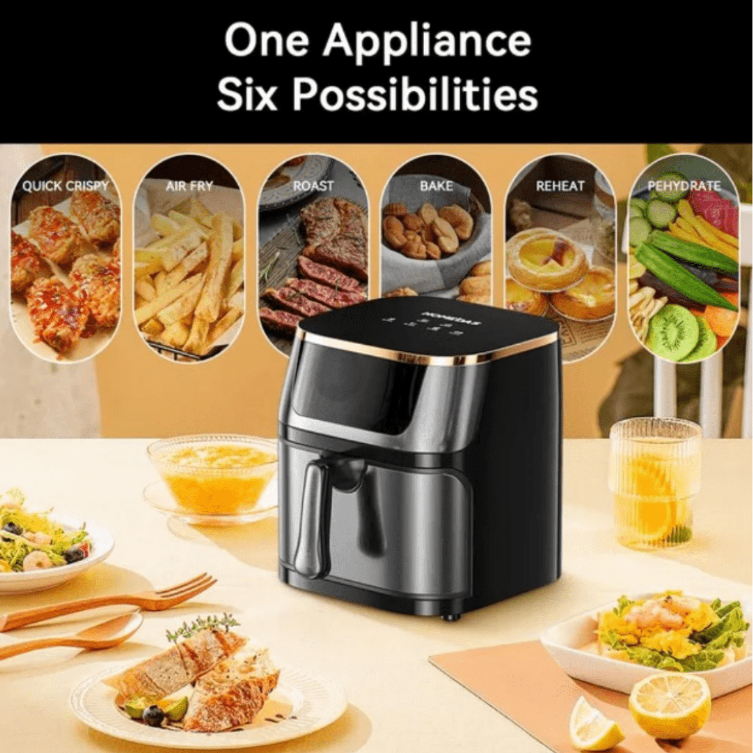• • 360 ° technology driven air fryer • Equipped with a large and intuitive touch screen and guided cooking One click cooking preset can be used for frying, baking, roasting, dehydration, etc