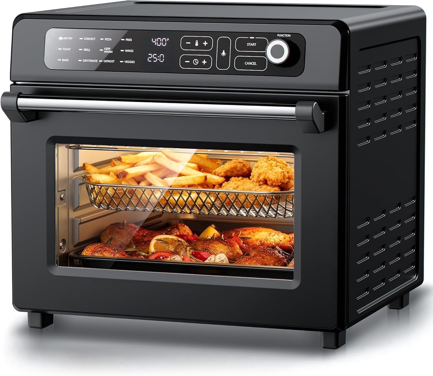 • ✔【25 QT Compact Convection Air Fryer Toaster Oven | Space-Saving Large Capacity】This 24QT compact air fryer toaster oven balances generous capacity with a space-saving countertop design, ideal for daily family use and small kitchens.It fits a 10–14″ pizza, multiple slices of toast,batches of roasted vegetables,or hearty small meals for 3 – 4 people with ease.As a versatile countertop convection oven solution, it meets all your quick,efficient cooking needs without taking up too much valuable counter space.