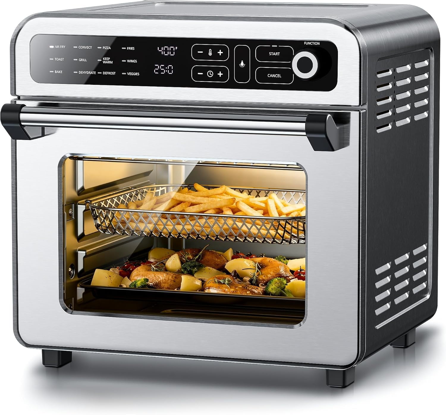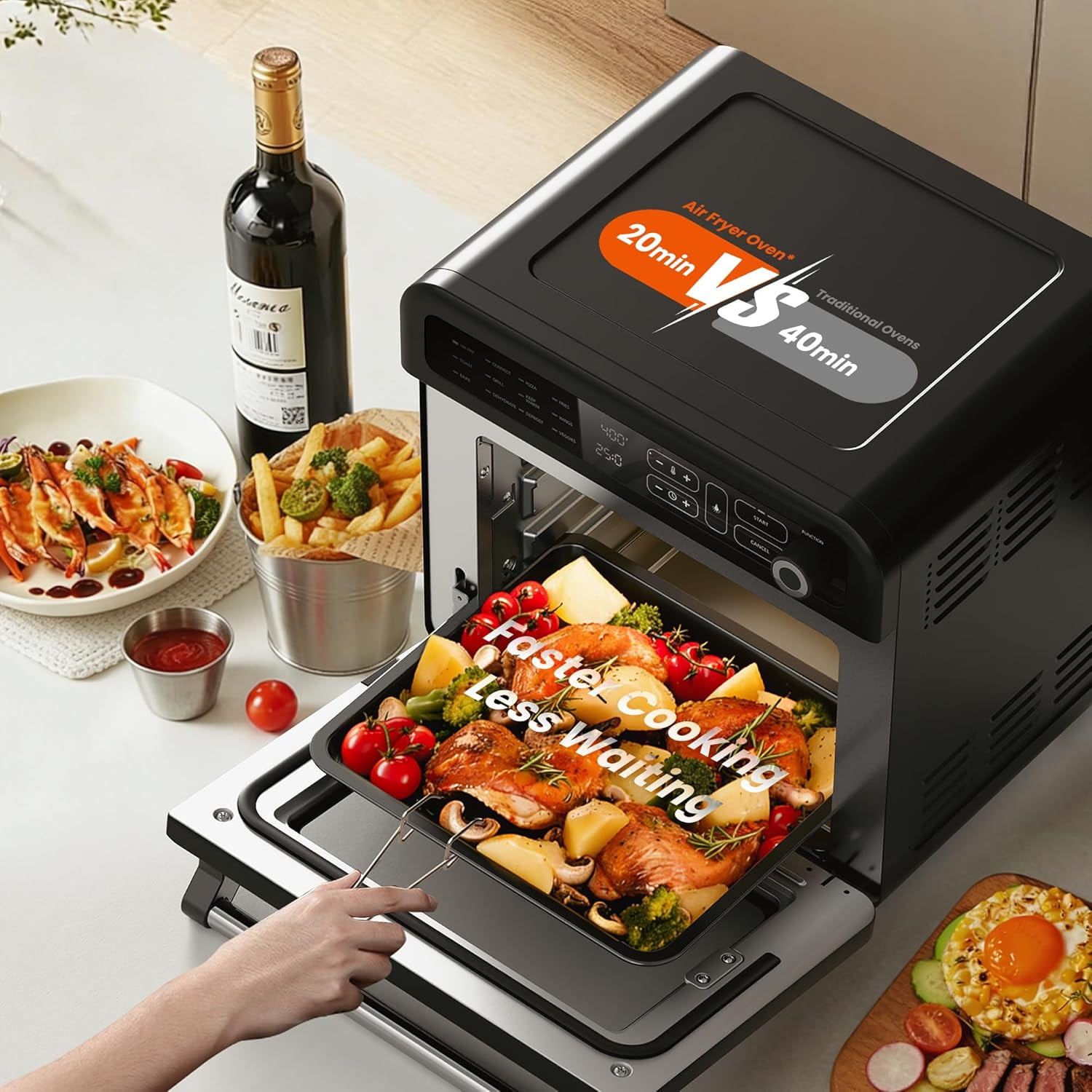 • ✔【All-In-One Air Fryer Toaster Oven with Complete Accessory Set】This multi-functional air fryer toaster oven comes with a full essential accessory set—including a cooking rack,non-stick air fryer basket,baking tray, and easy-clean crumb tray.Everything you need to air fry,bake,roast,toast and broil is included, ready to use right out of the box.No extra purchases required, it perfectly caters to all your multi-use kitchen appliance needs for endless cooking possibilities.