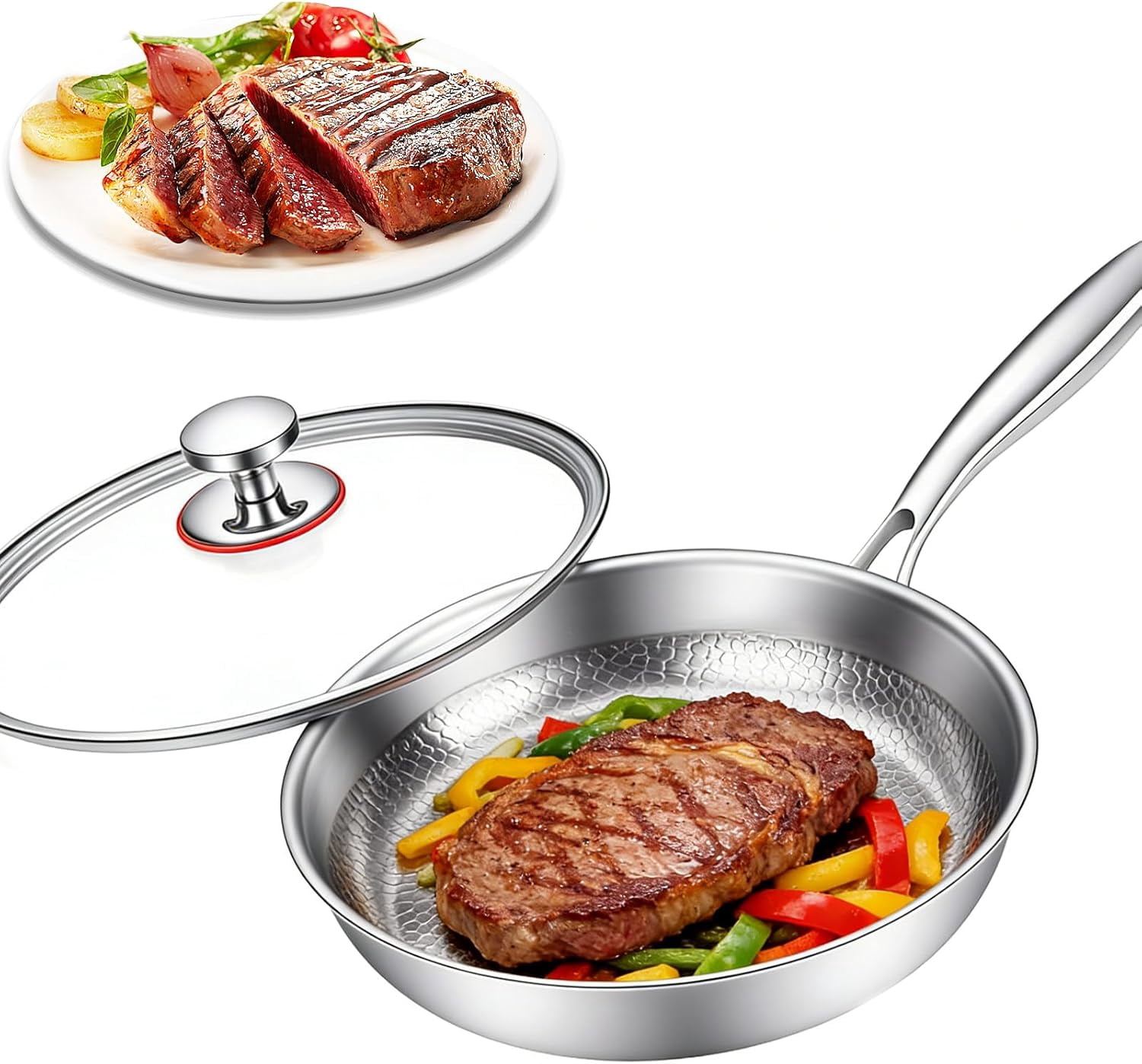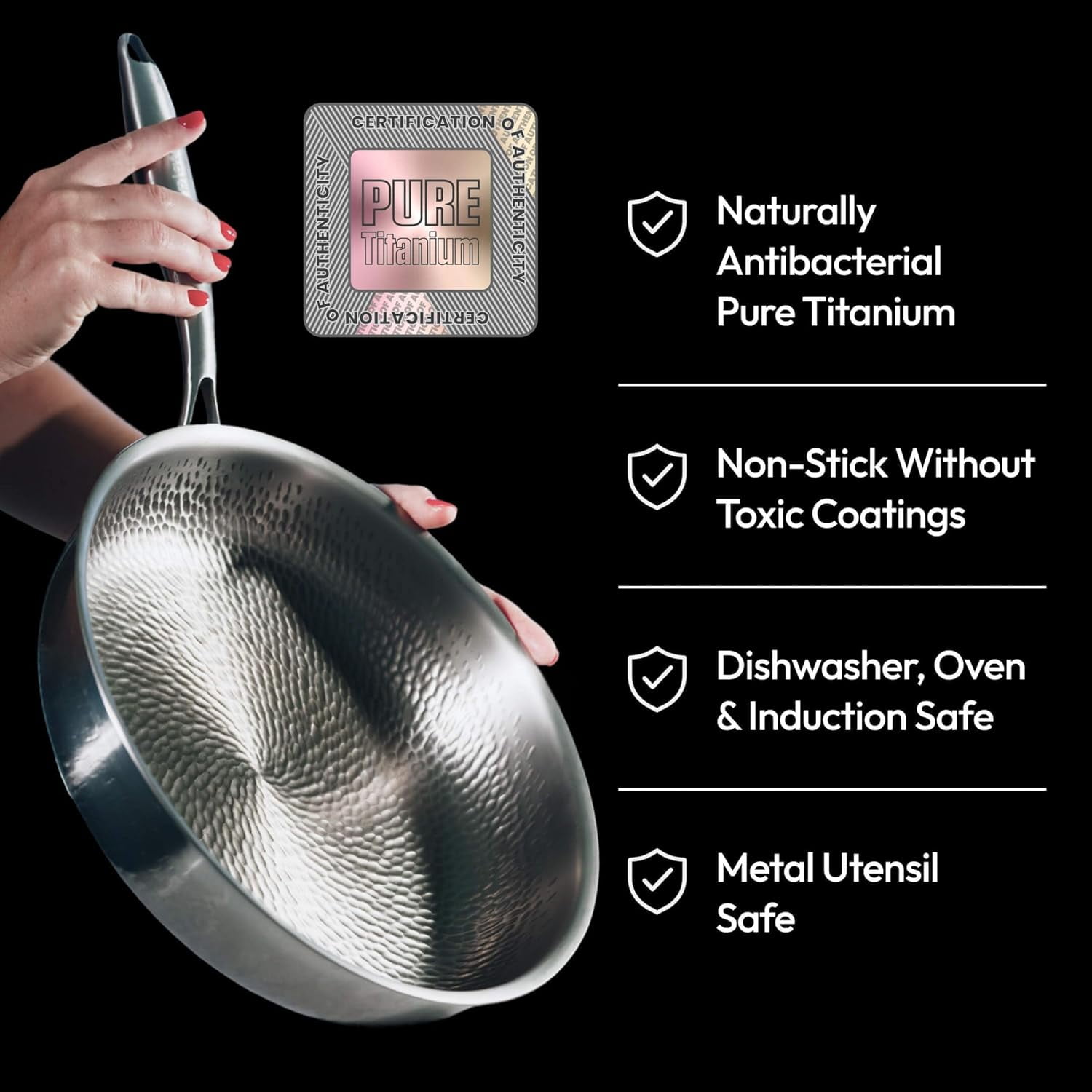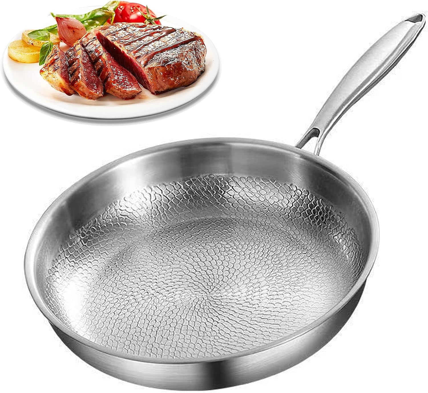 - 【Releasing Hammered Surface · Easy to Clean】Featuring a hammered titanium surface, this titanium pro pan helps food release smoothly without added surface coatings. The textured design supports easier cleaning and consistent cooking results, offering a practical and low-maintenance titanium skillet for daily meals