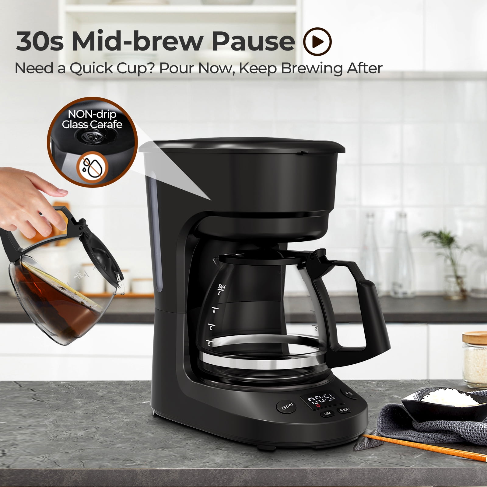 • Convenient Warmth: Maintains coffee temperature for 2 hours with a keep-warm plate and offers a 30-second auto-pause feature for pouring a cup mid-brew without spills.