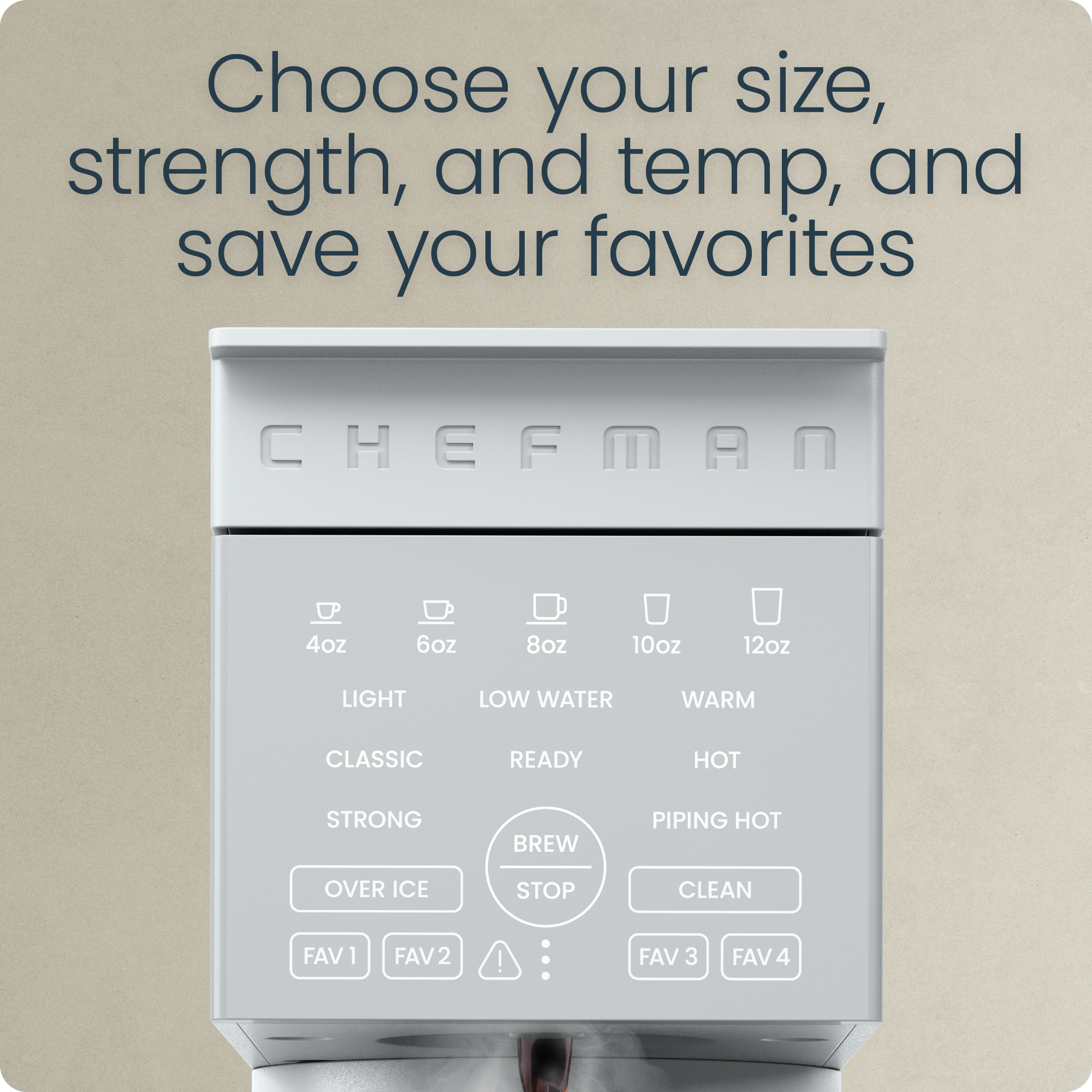 Get excited to wake up and smell the coffee with the Chefman Caffeinator, a single serve coffee machine that helps you enjoy your morning pick-me-up your way. Compatible with both coffee pods or your favorite ground coffee, you can serve up your ideal roast your way. With five size options (4, 6, 8, 10, and 12 ounces), 3 brew strength settings, and 3 temperatures, you can customize your drip coffee to your exact preference. Program each person’s favorite directly into the machine for a delicious one-touch brew. Choose the Over Ice option to lower brewing temperature even further, creating refreshing iced coffee without melting the ice. Adjust your mug height to ensure minimal spatter during brewing. The 48 oz. water reservoir is fully removable and comes with a charcoal filter to keep each cup tasting as fresh as the first. The user guide also comes with five barista-level beverage recipes, from making delicious mochas without an espresso machine to boozy carajillos. With a gorgeous matte-white finish and narrow design, this is a coffeemaker you’ll be proud to show off. cETL approved with advanced safety technology for long-lasting durability and a 5-year assurance provided by Chefman. 1500W/120V – RJ14-DB-CON-WM New