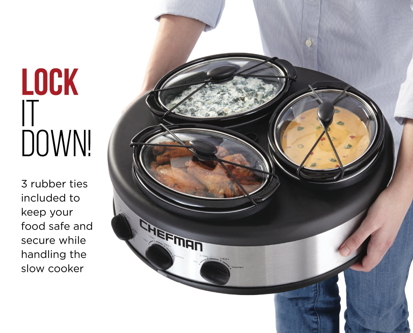 MULTI-FUNCTIONAL: The Chefman Triple Slow Cooker & Buffet Server is more than just a slow cooker; this multipurpose appliance allows you to make three meals at once. The perfect addition to your kitchen, it works great when cooking for a crowd at Thanksgiving, making dinner for the family, or simply warming up leftover food.