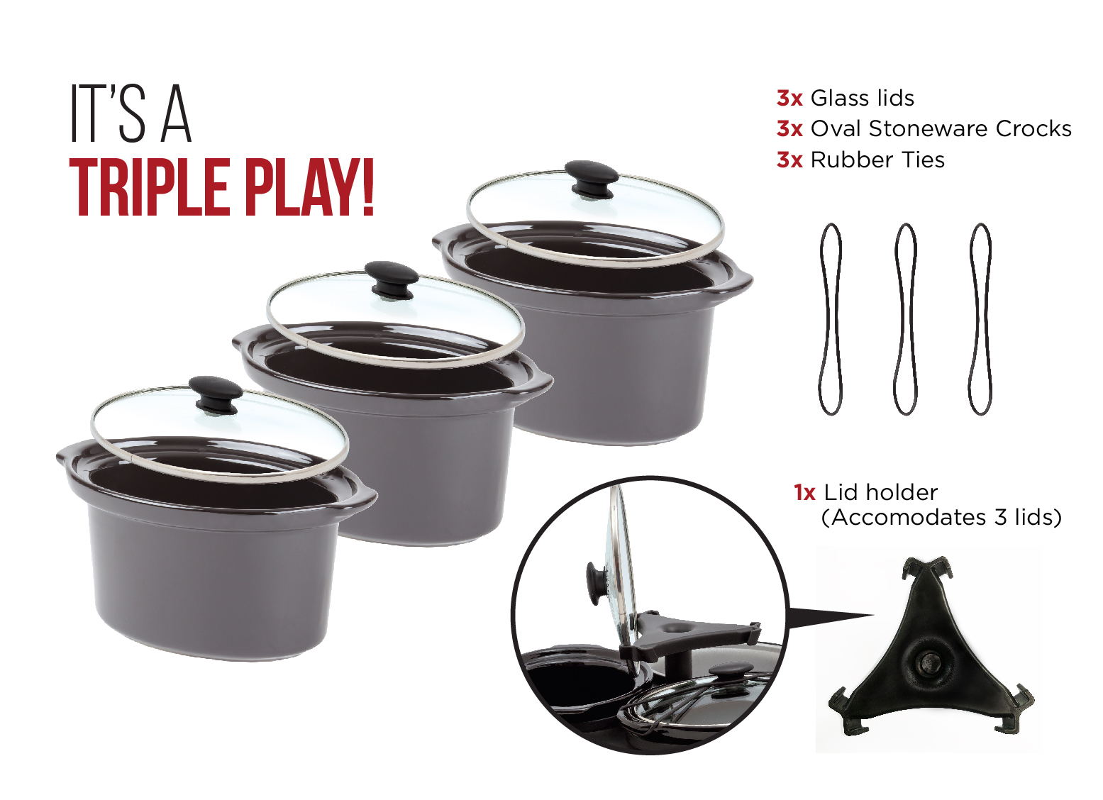 VERSATILE: With triple removable 1.5 quart crock pot inserts, it can be used to create a wide range of delicious meals, as well as a stylish food server and chafing dish. Each of the slow cooker crocks has an independent temperature control, making it the ideal tool for multi-dish cooking or picky eaters.