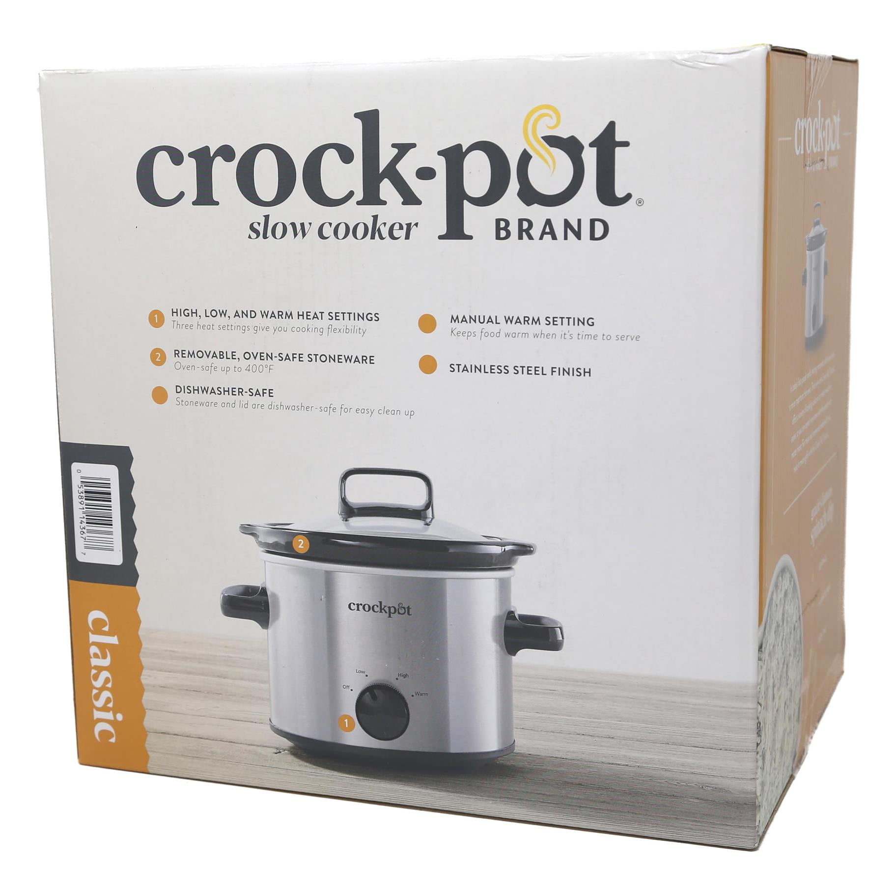 3 Manual Heat Settings: Choose from high, low, and warm, for cooking flexibility no matter what you’re making 2-Quart Capacity: Feeds 2+ people and is perfectly sized for preparing small meals, dips, and sides Keep Warm Setting: The manual warm setting allows you to keep your food at serving temperature when it’s time to eat Oven-Safe Stoneware: Removable stoneware is oven-safe up to 400 degrees F Dishwasher-Safe: Stoneware and lid are both dishwasher-safe, for easy cleaning Modern Look: Stainless steel finish Specifications Dimensions (Overall): 9.5 Inches (H) x 9.5 Inches (W) x 7.6 Inches (D) Weight: 5 Pounds Capacity (Volume): 2 Quart Features: Keep Warm Setting, Removable Stoneware Pot Number of Settings: 3 Includes: 2 Quart Pot Safety and Security Features: Stay-Cool Handles Appliance Capabilities: Reheat, Warmer Wattage Output: 100 Watts Material: Stoneware, Stainless Steel, Plastic Care & Cleaning: Spot or Wipe Clean, Dishwasher-Safe Parts TCIN: 83360912 UPC: 053891143677 Item Number (DPCI): 072-10-0132 Origin: Imported Description From homemade meals to delicious dips and sides, the Crockpot™ 2-Quart Classic Slow Cooker makes it easy to feed friends and family. Choose from 3 heat settings—high, low, and warm—for cooking flexibility and control with whatever you’re making. This small slow cooker has a 2-quart capacity that feeds 2+ people and is perfect for making small meals or dips. Use the manual warm setting to keep food warm while you are serving, or for heating up leftovers. The removable stoneware is oven-safe up to 400 degrees F, so you can put it in the oven to add a delicious finishing crisp to your favorite meals. When cooking is done, both the lid and stoneware can be placed in the dishwasher for easy cleanup. For moments, memories, and meals worth sharing, make it with Crockpot!
