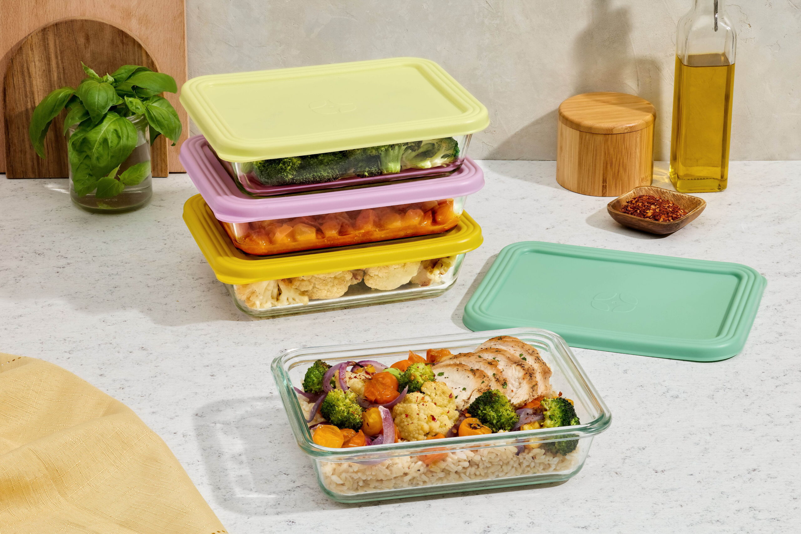 5 Days of Meal Prep: Contains five 4.5 cup glass food containers and press fit leak resistant lids.