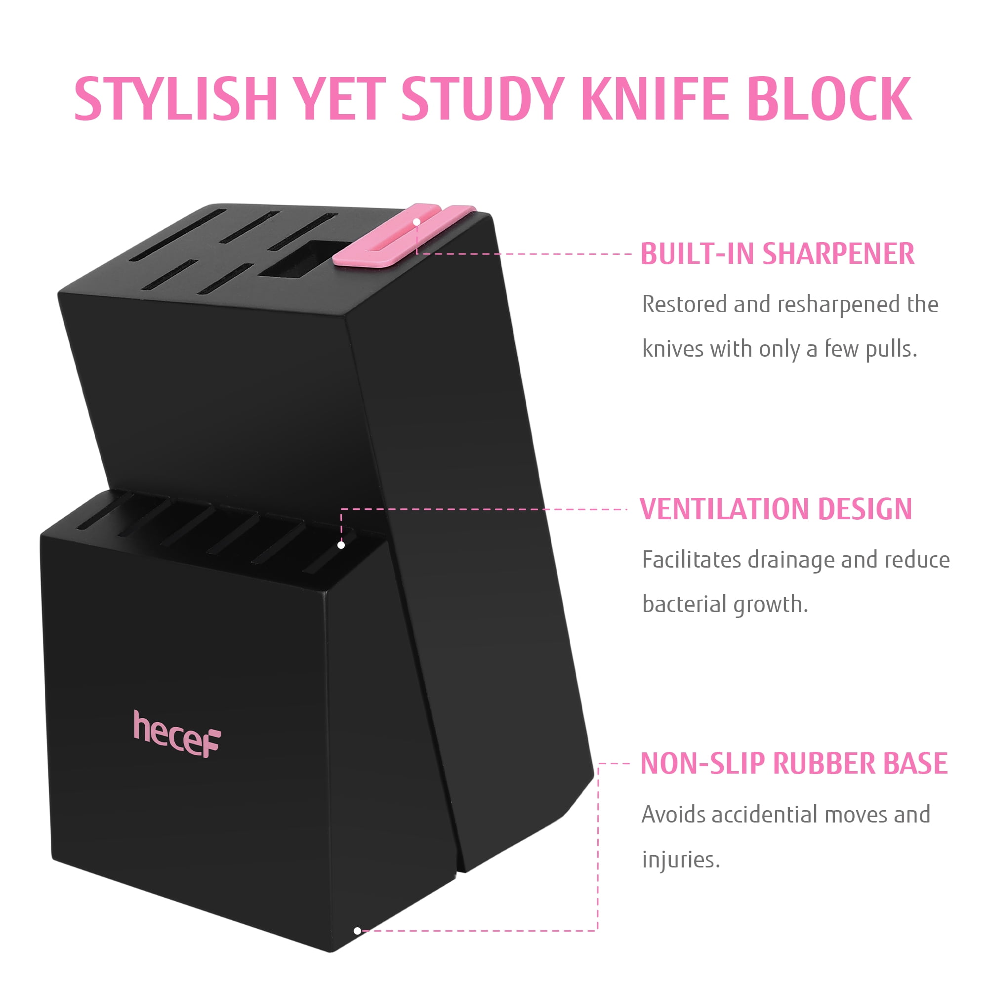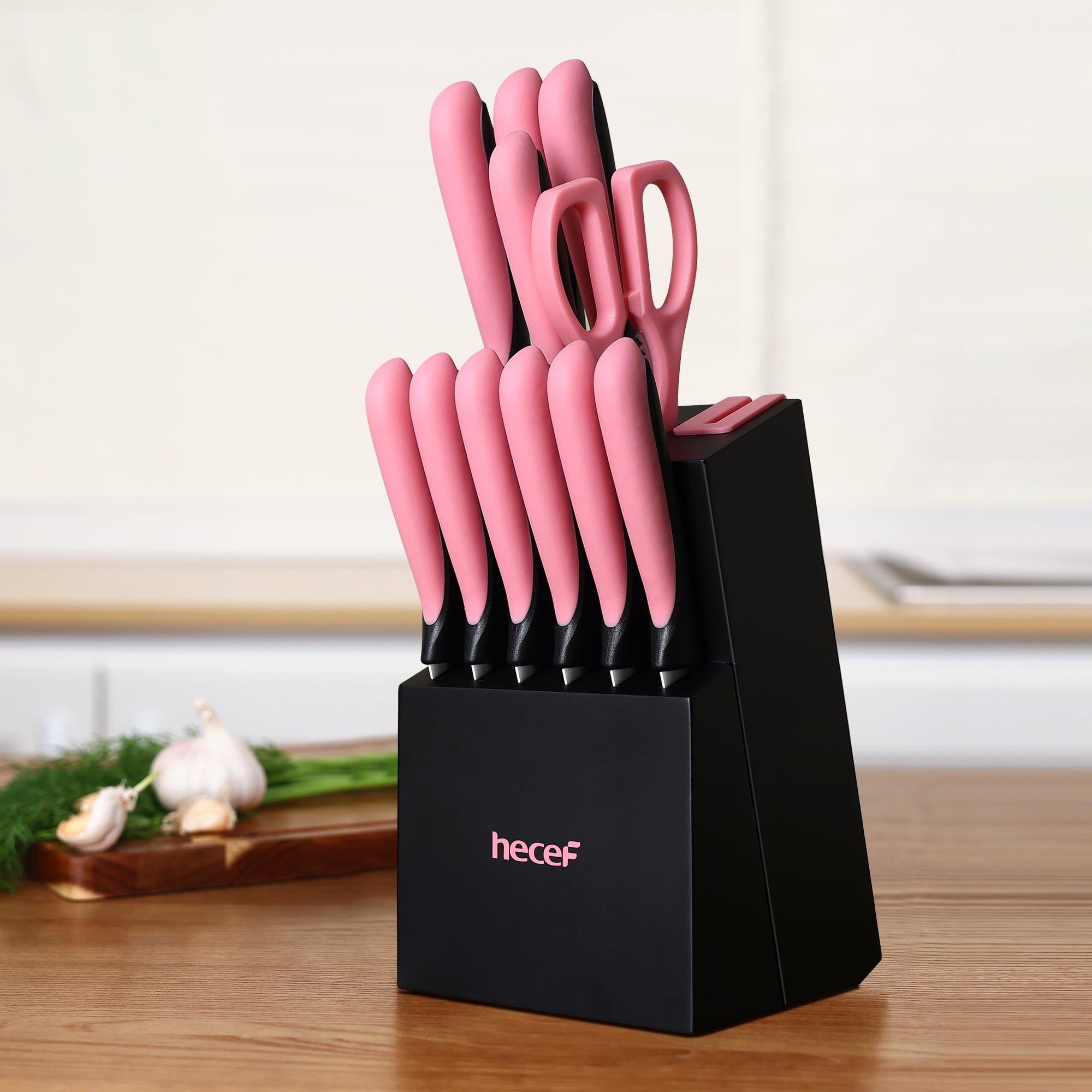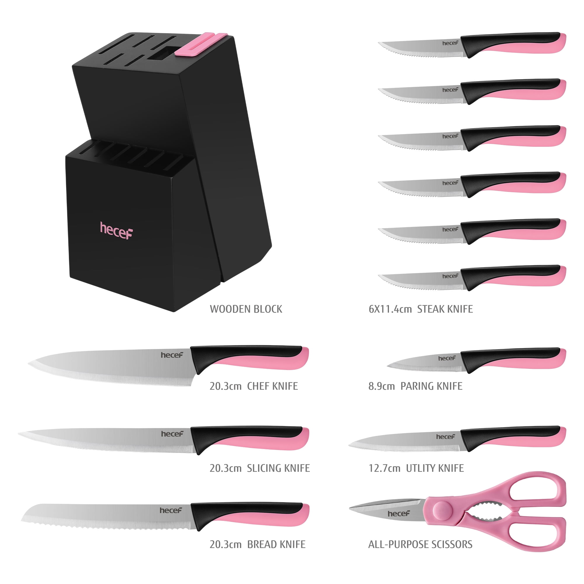 Elevate your kitchen with the Hecef 13-Piece Knife Set, crafted with high-quality stainless steel blades that boast exceptional sharpness and rust resistance. This comprehensive set includes essential knives for all your cutting needs, from slicing and dicing to bread and steak. Featuring ergonomic handles and a space-saving wooden block with a built-in sharpener, this versatile set ensures precise, comfortable, and efficient performance. Available in a range of stylish color options, it makes a thoughtful gift for any home chef. Pleas Note:The 4 colors of knives use the same packaging, and the packaging is all pink knives. You open the package and check, and the knife inside is the color of the knife you purchased.