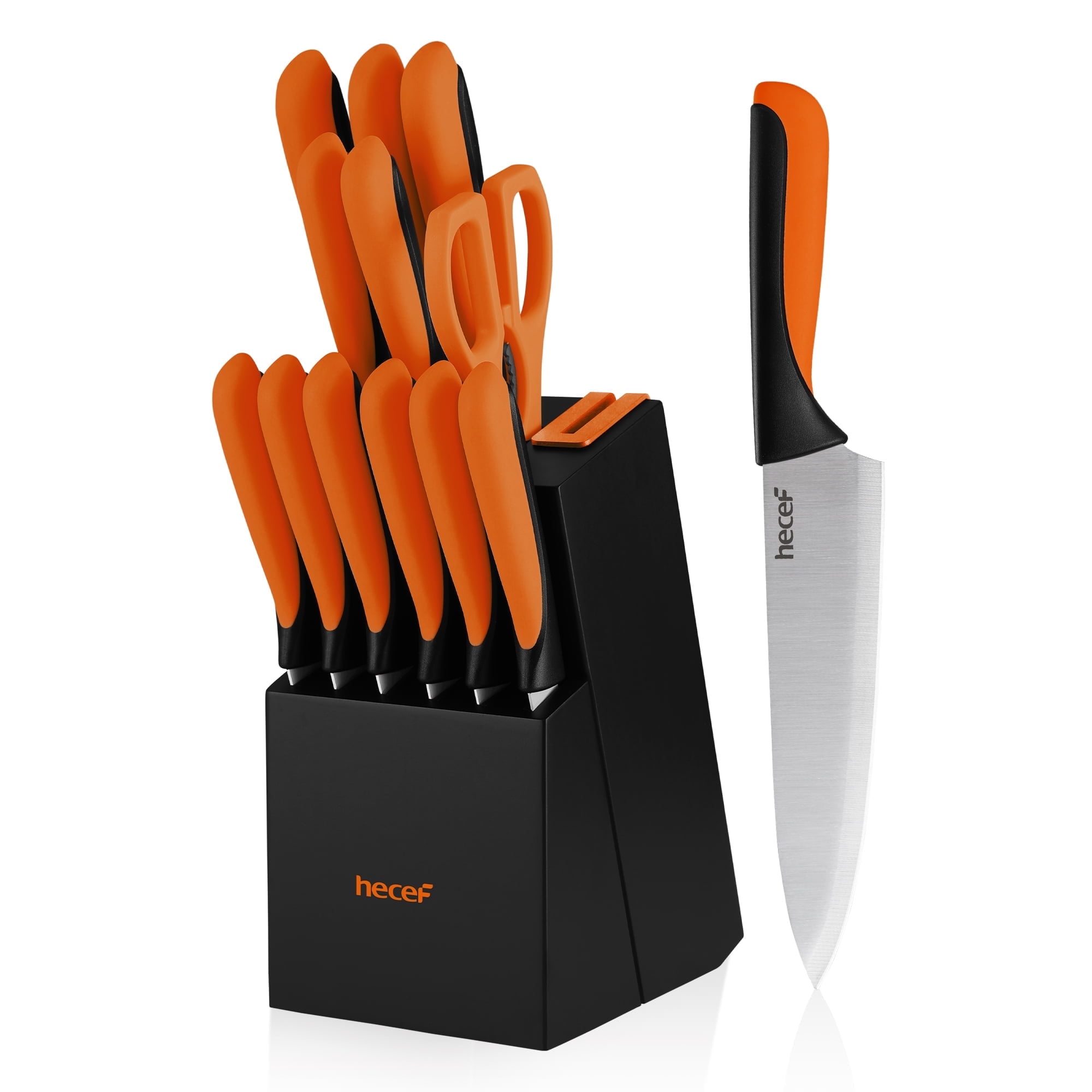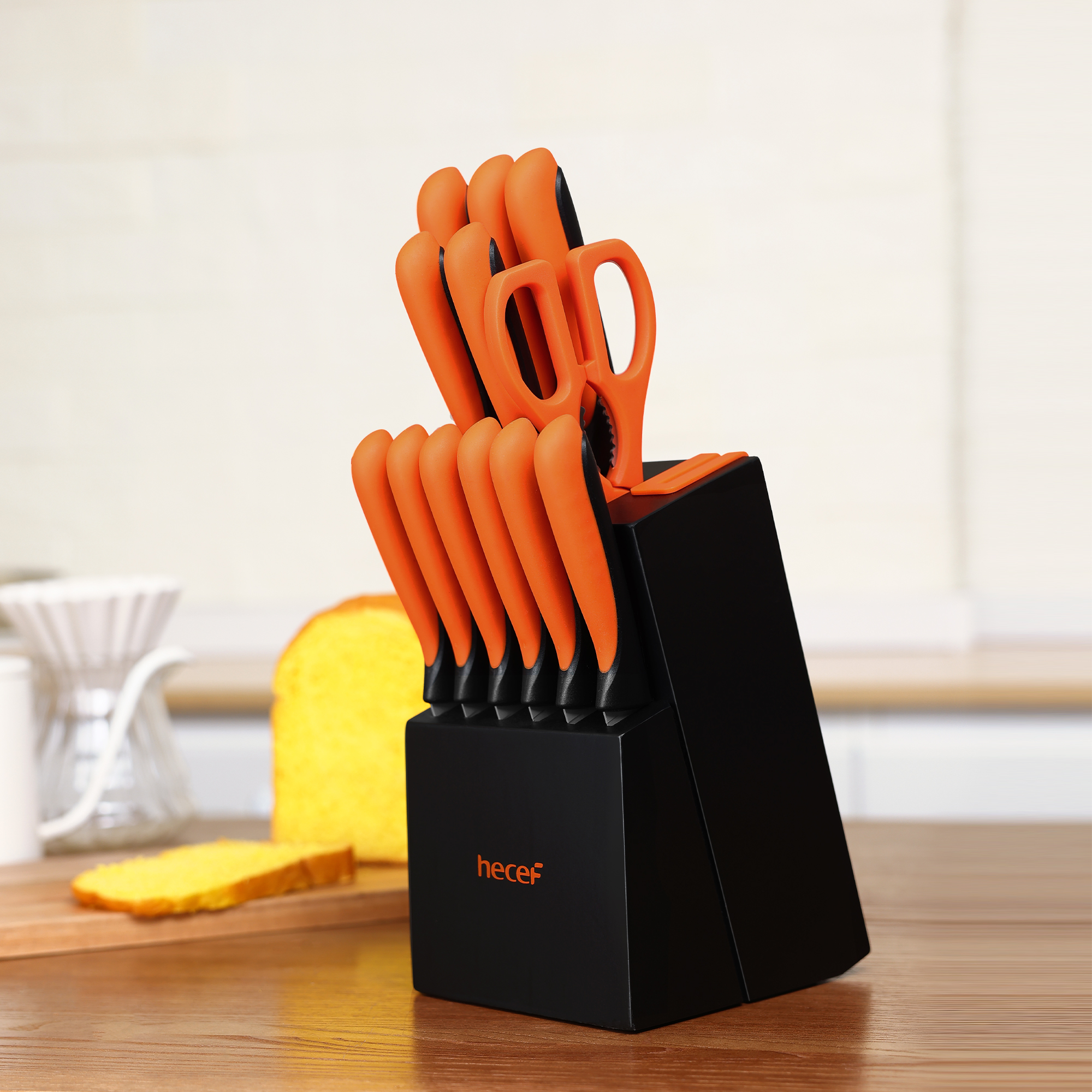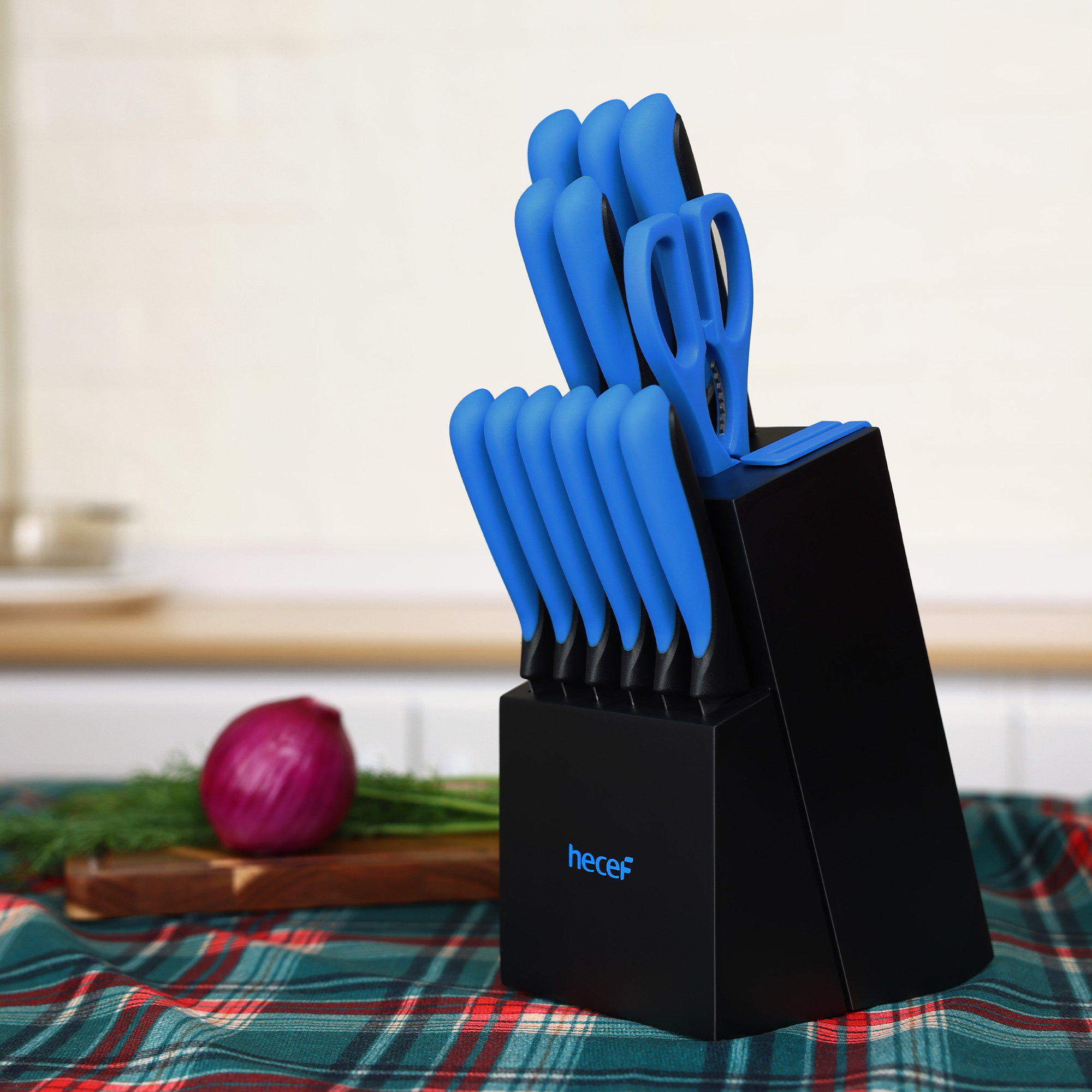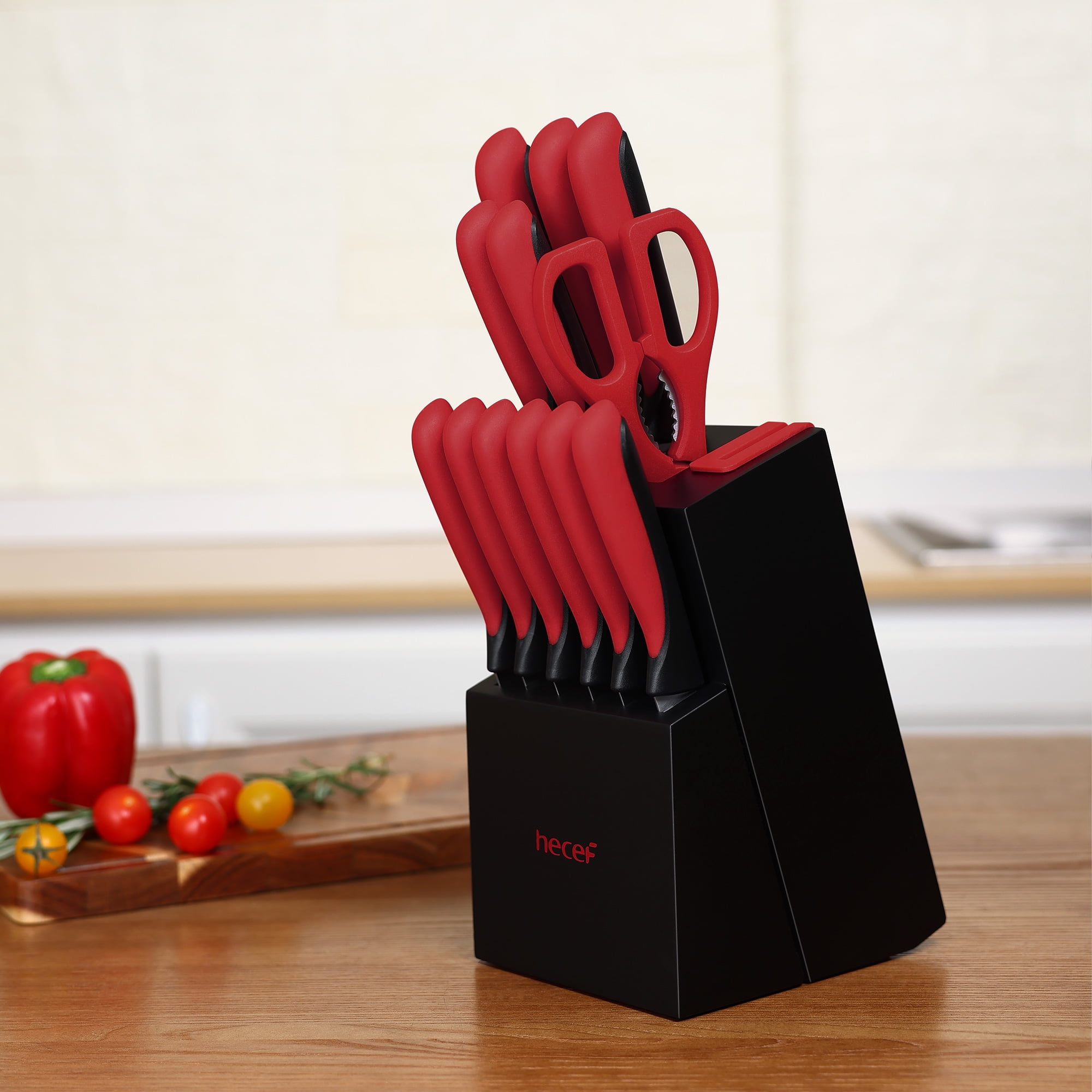 Elevate your kitchen with the Hecef 13-Piece Knife Set, crafted with high-quality stainless steel blades that boast exceptional sharpness and rust resistance. This comprehensive set includes essential knives for all your cutting needs, from slicing and dicing to bread and steak. Featuring ergonomic handles and a space-saving wooden block with a built-in sharpener, this versatile set ensures precise, comfortable, and efficient performance. Available in a range of stylish color options, it makes a thoughtful gift for any home chef. Pleas Note:The 4 colors of knives use the same packaging, and the packaging is all pink knives. You open the package and check, and the knife inside is the color of the knife you purchased.