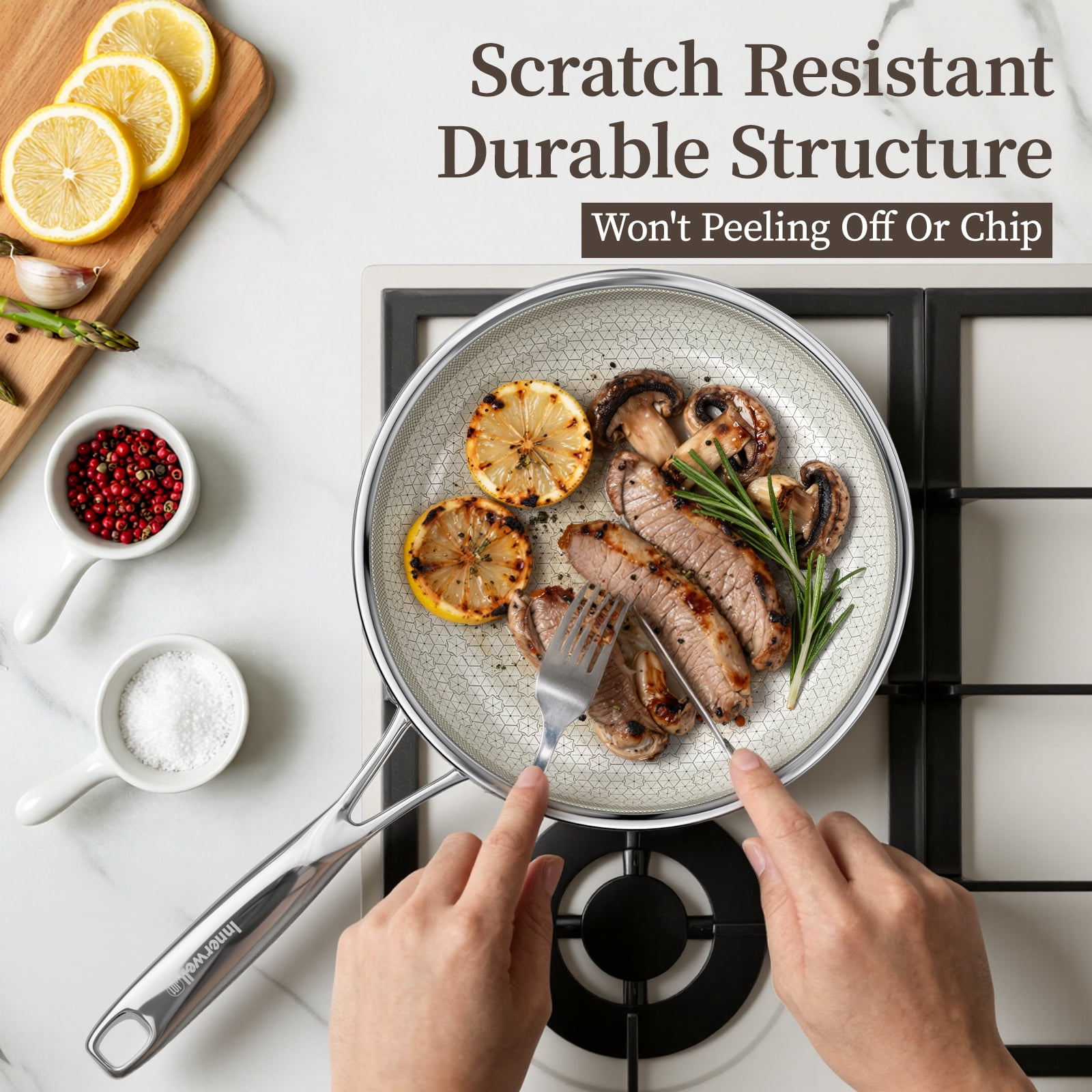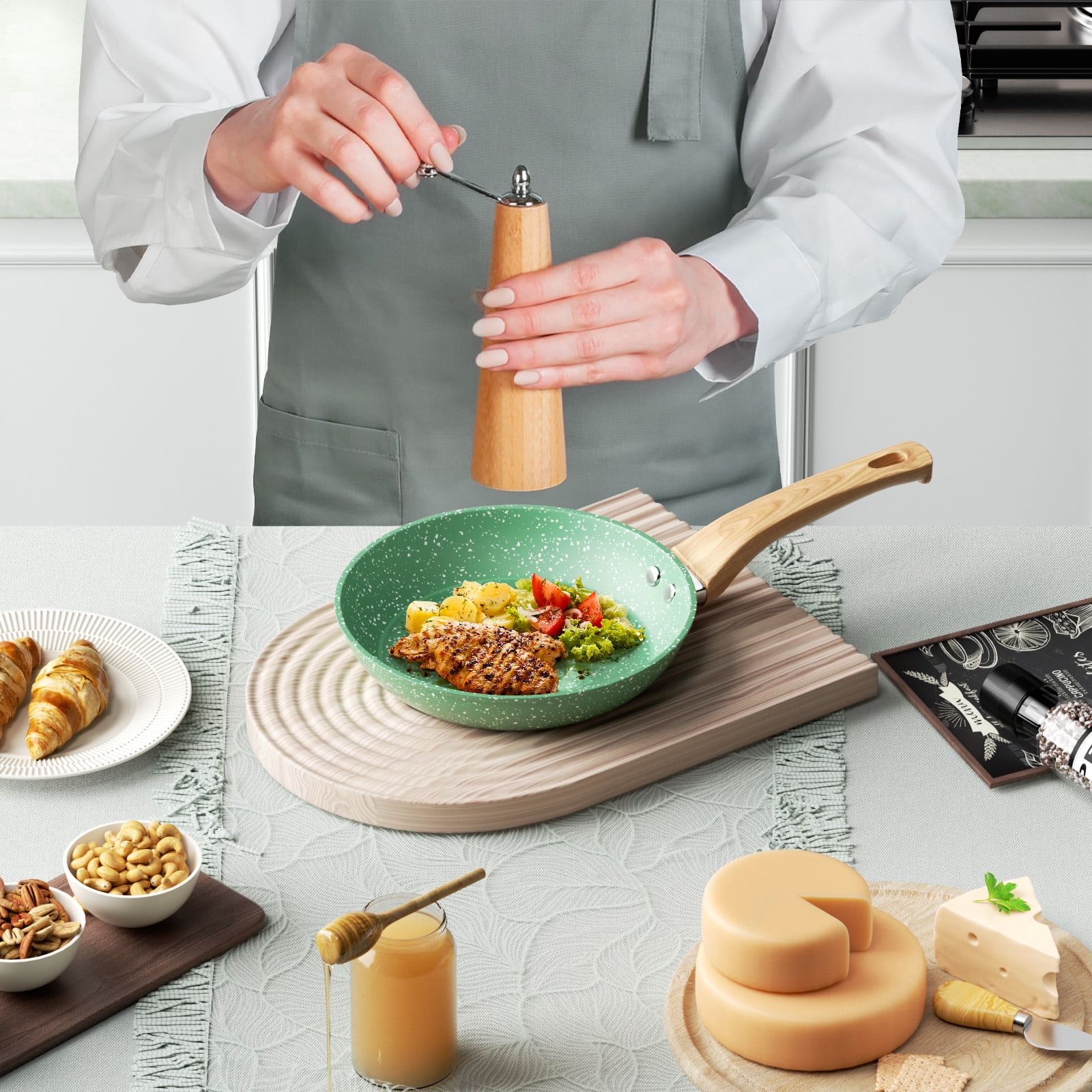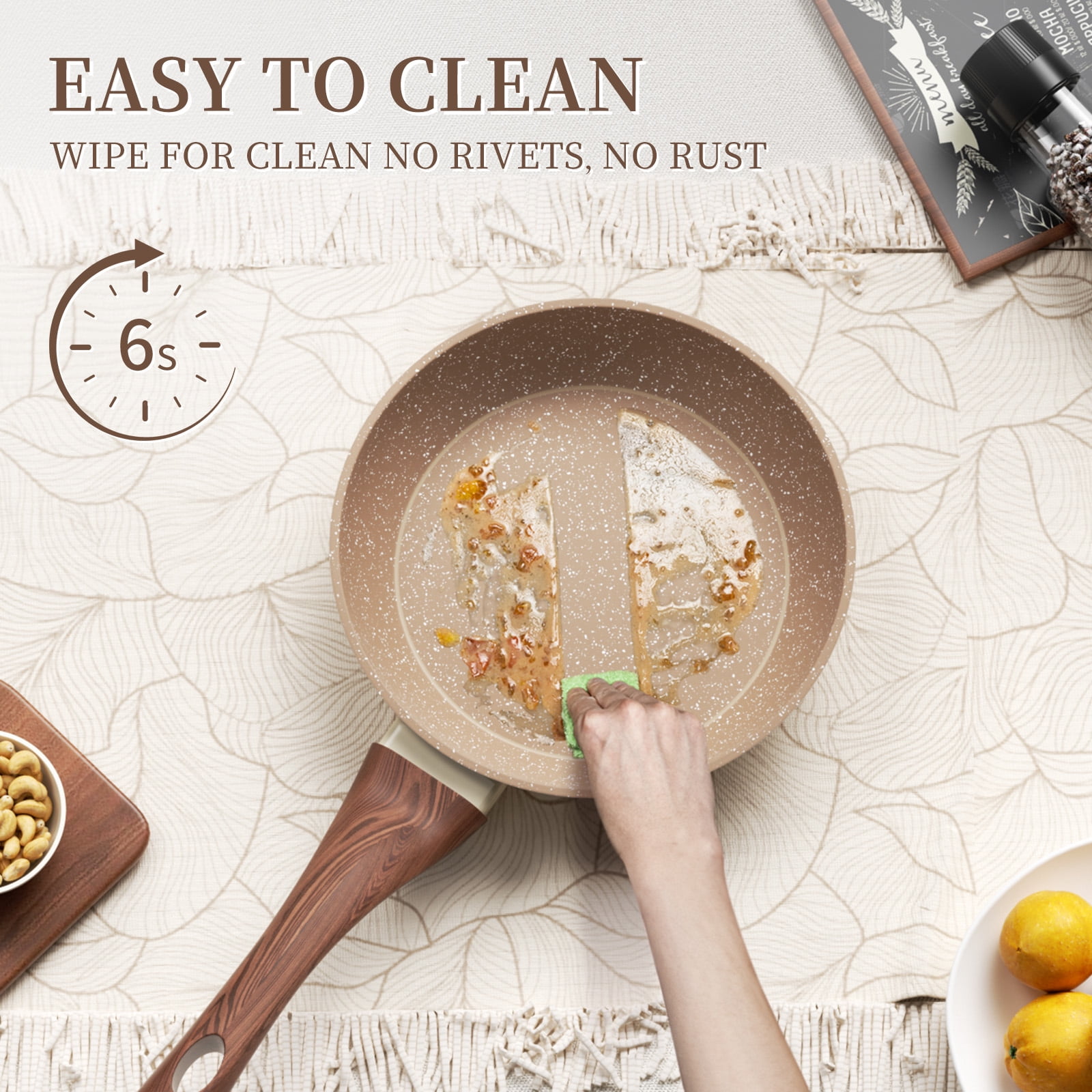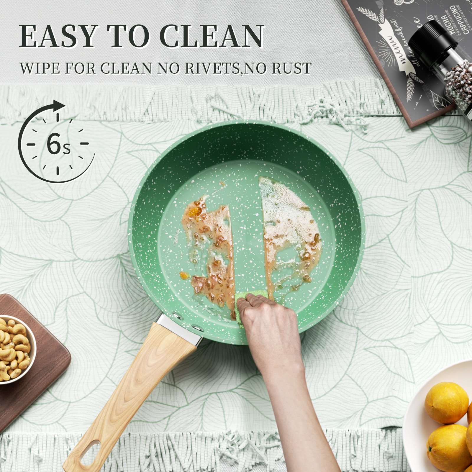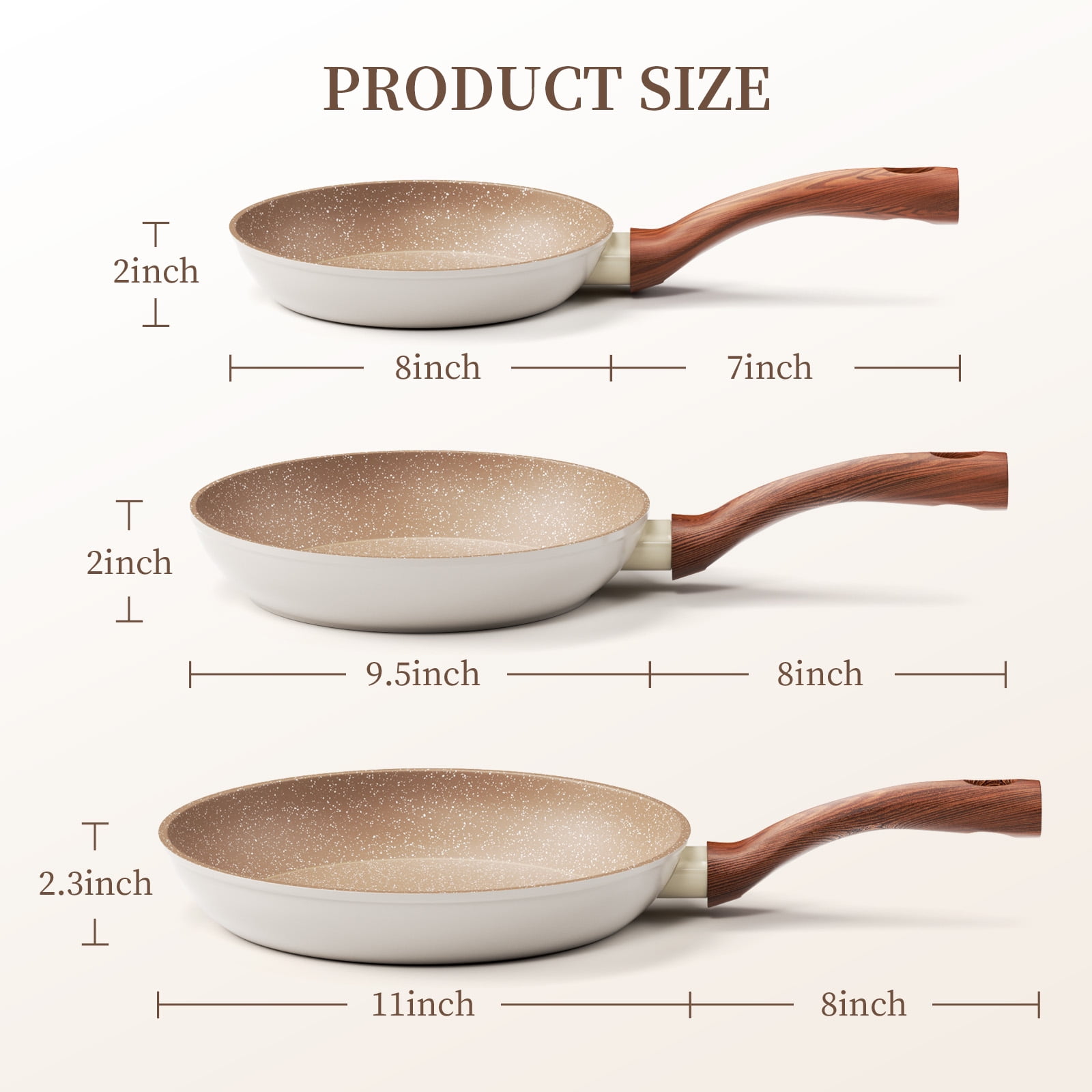 Wood-Grained Bakelite Handle – The wood-grained handle of non stick pans made of lightweight and sturdy bakelite can keep it cool while cooking. It’s strongly fixed to a saute pan by double rivets, remaining a long lifetime. The ergonomic design makes it stable and easy to operate even for women and the elderly.