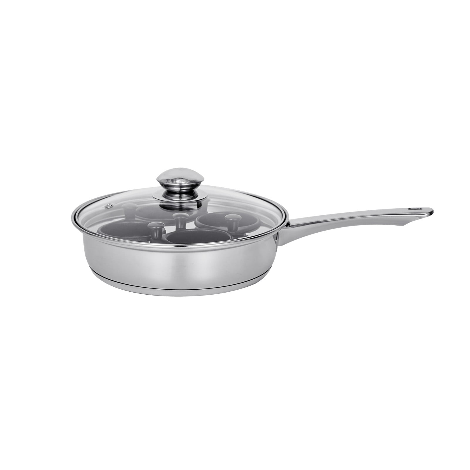 KFFKFF 4-Cup Egg Poaching Pan, Stainless Steel Poacher and Frying Pan with Nonstick Removable Cups, Glass Lid, and Silicone Spatula, Suitable for Induction Cooktops