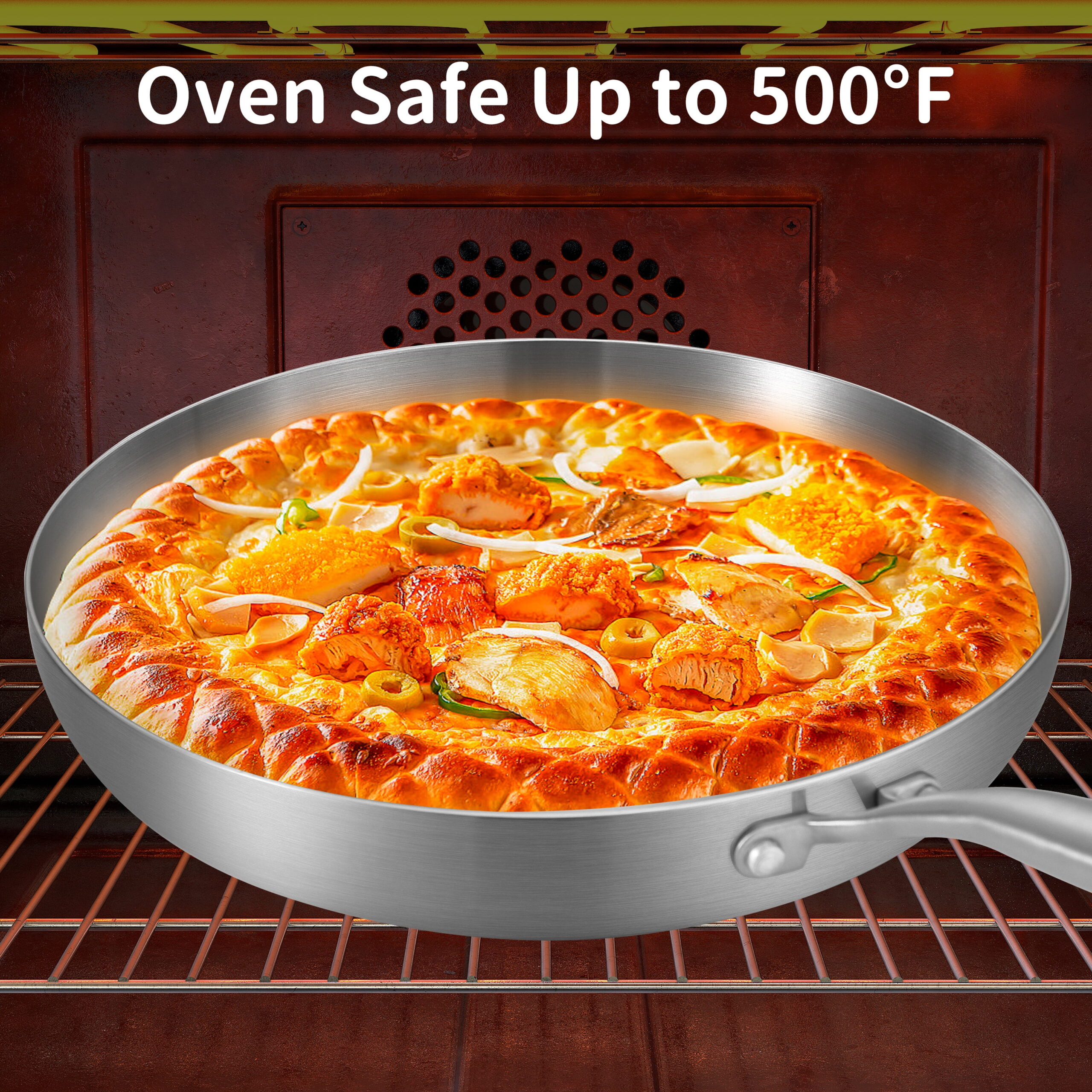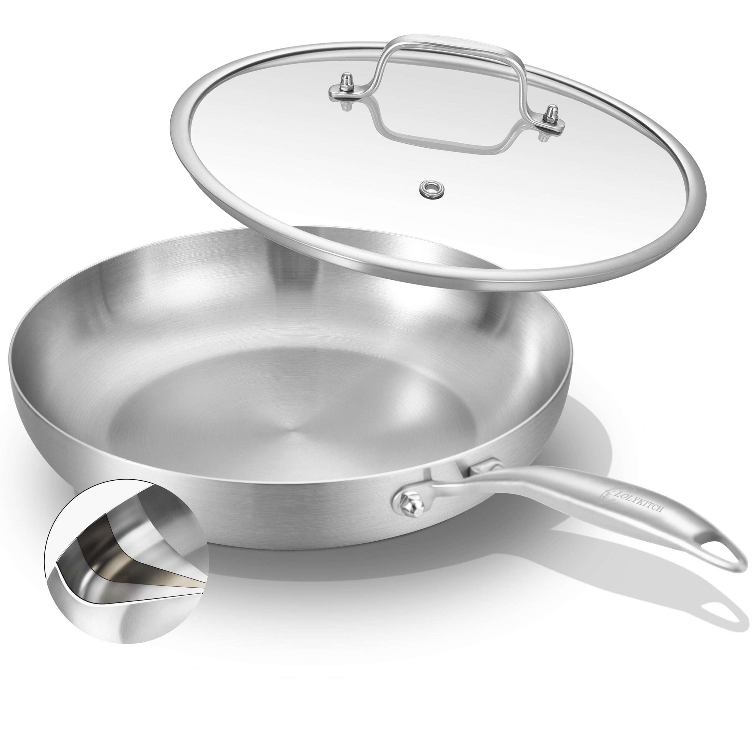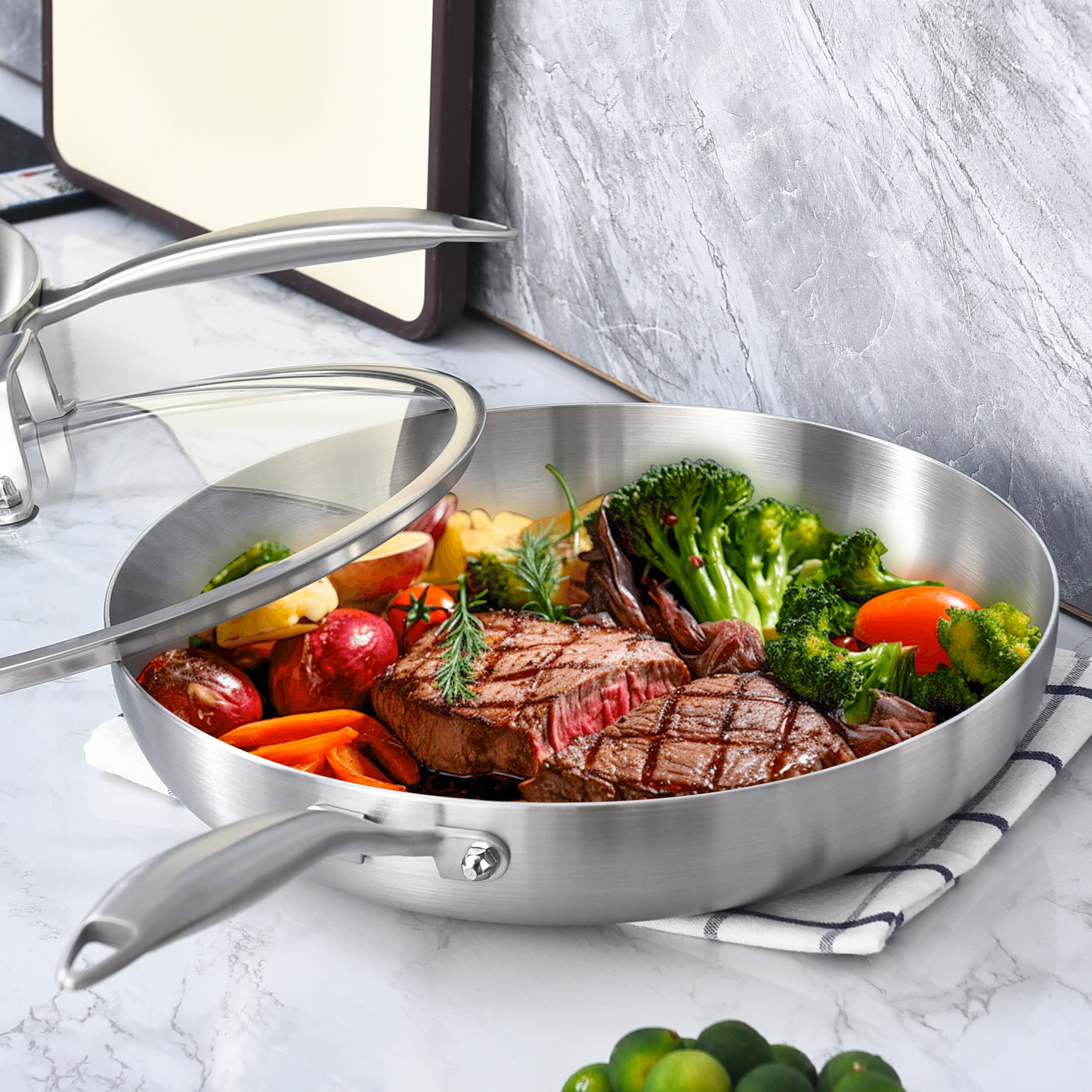 【Glass Lid with Steamer Vent】This 12 Inch stainless steel pan with a Glass Lid with a steam vent allows you to monitor your food through the lid during the cooking.