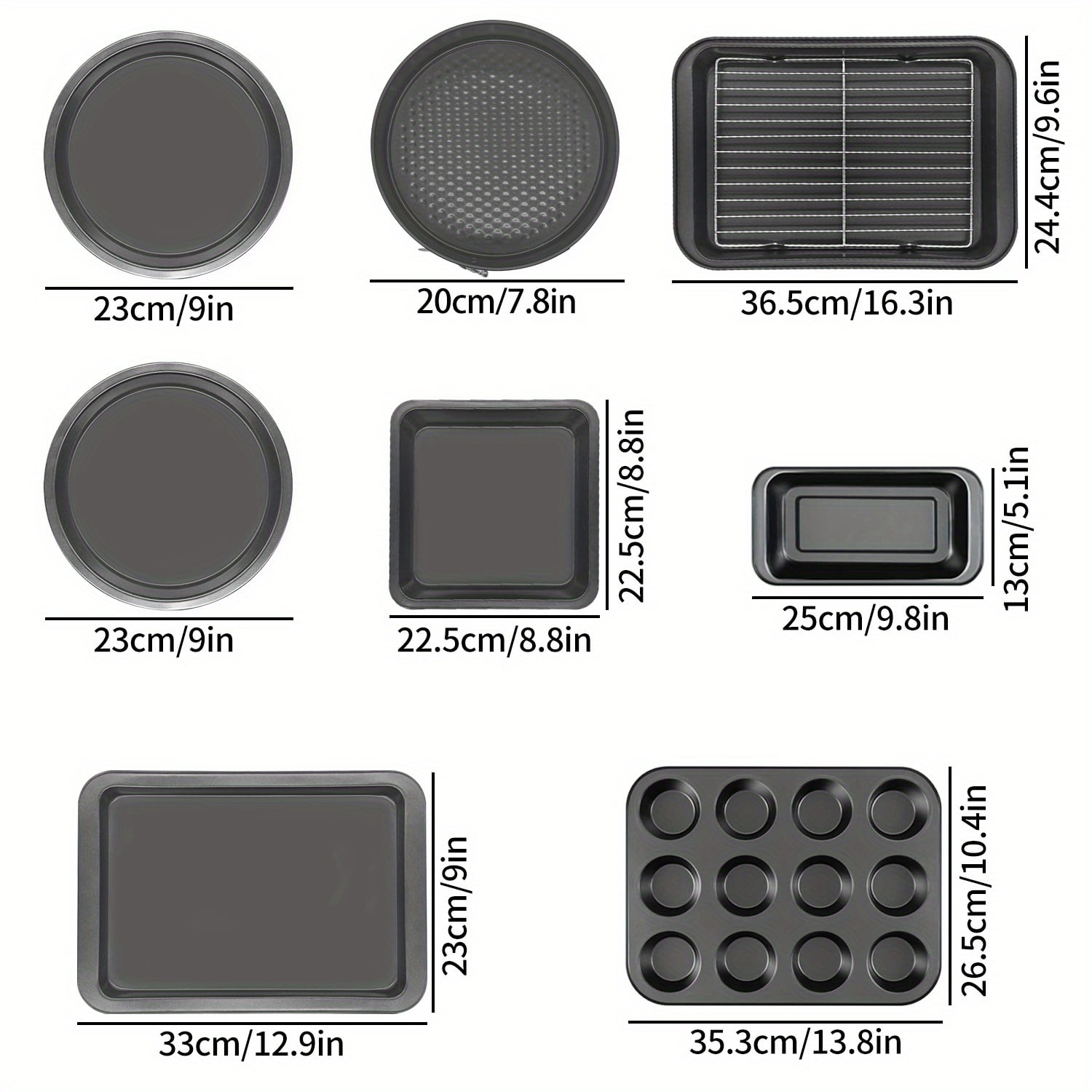✔Including: 1 Square Pan 8.8 IN (22.5cm); 1 Roster Pan with rack (Roaster with rack)16.3 IN L x 9.6 IN W (33.5 x 24.4cm); 1 Cookie Sheet 12.9IN L x 9 IN W (33 x 23cm); 1 12 Cup-Muffin Pan 13.8 IN L x 10.4 IN W (35.3 x 26.5cm);2 pizza pan 9 IN (23cm); 1 Loaf Pan 9.8IN L x 5.1IN W (25 x 13cm) ; 1 Non-Stick Springform Cake Pans (Cheesecake Pan) 7.8IN (20cm) ; 8-Piece Stainless Steel Measuring Cups
