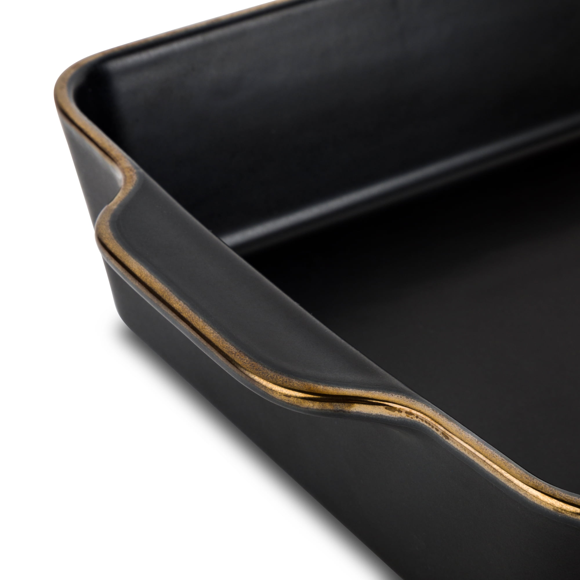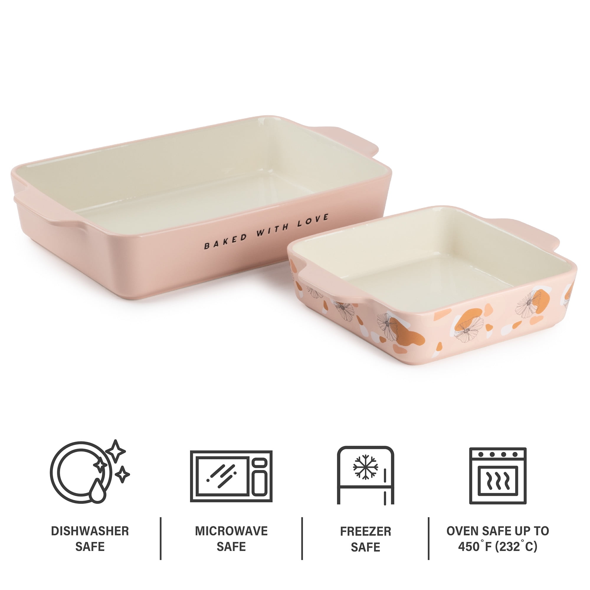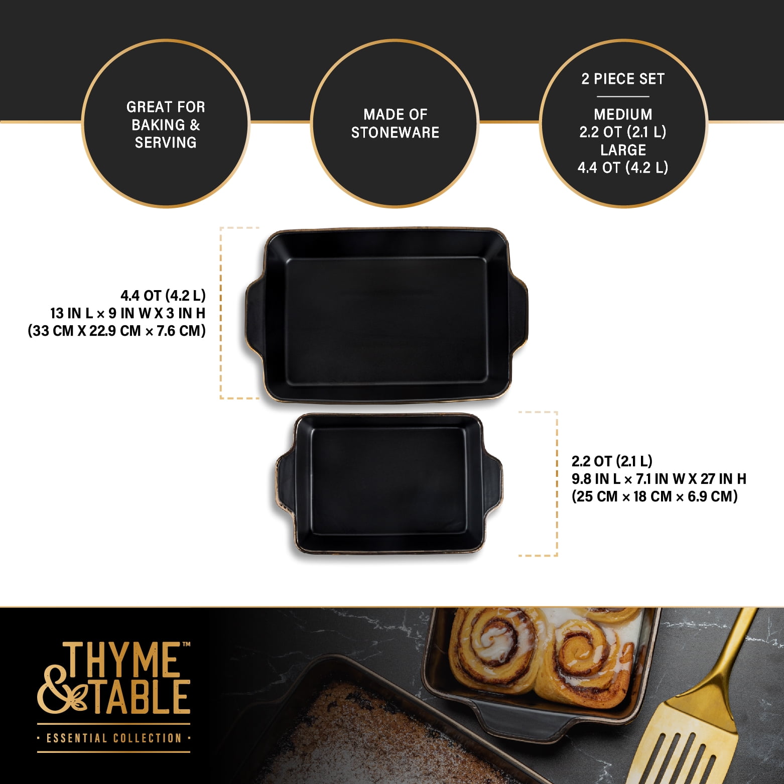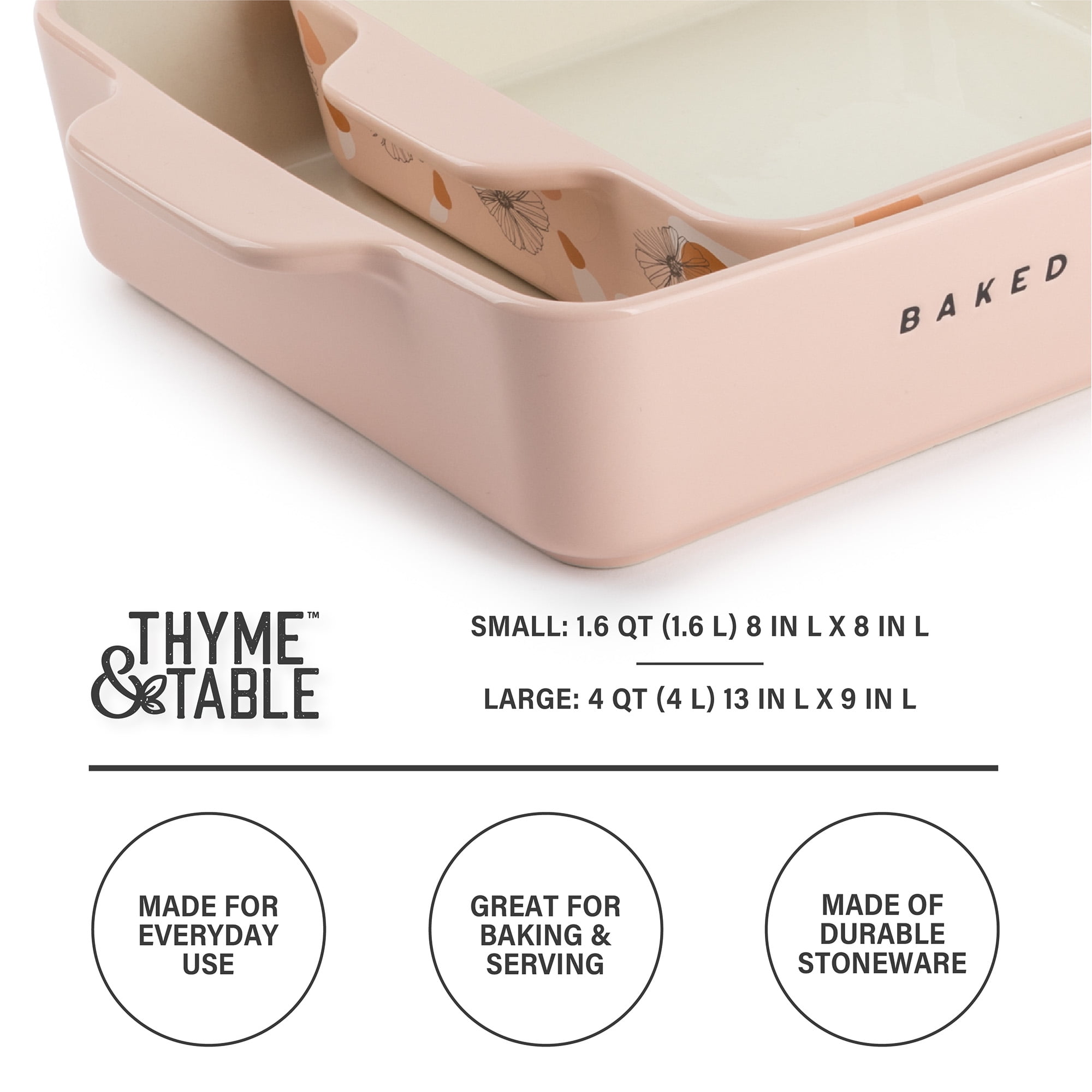 • Set Contents: Includes a large 13.07″ L x 9″ W x 2.55″ H, 4QT baking dish and a medium 10.19″ L x 7.08″ W x 2.28″ H, 2.1 QT baking dish.