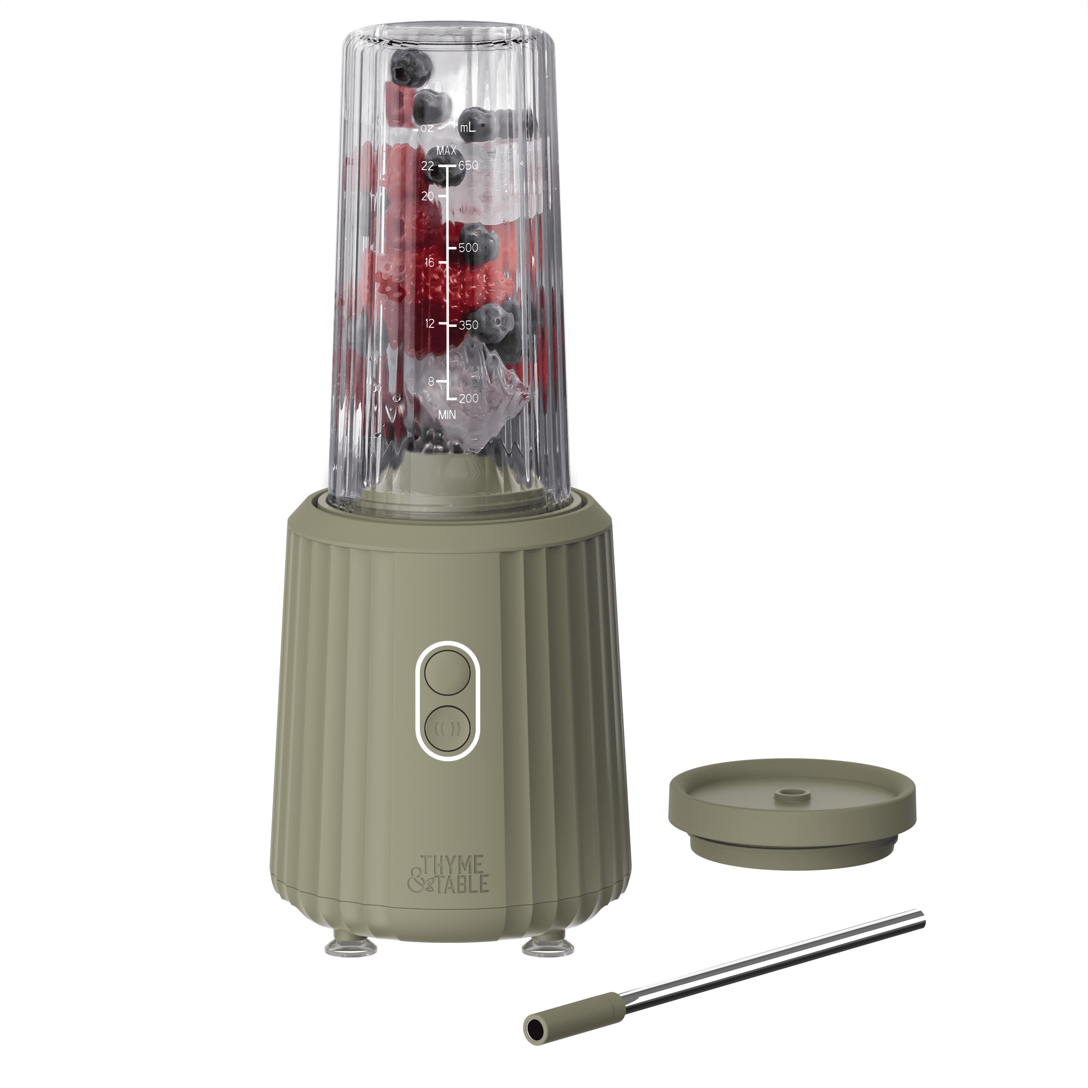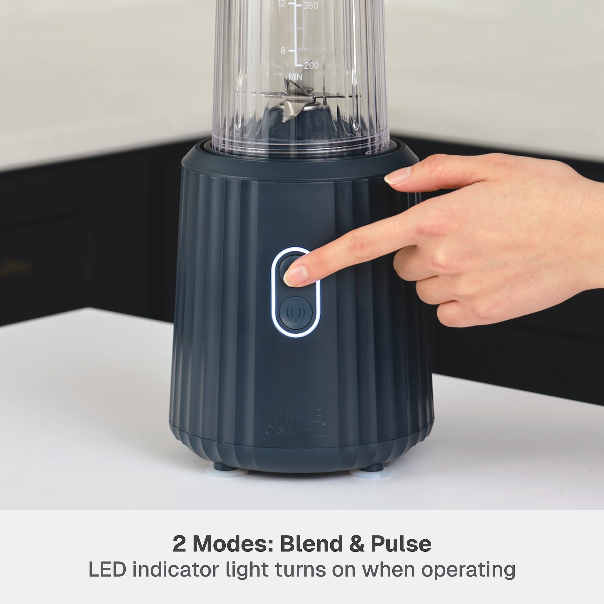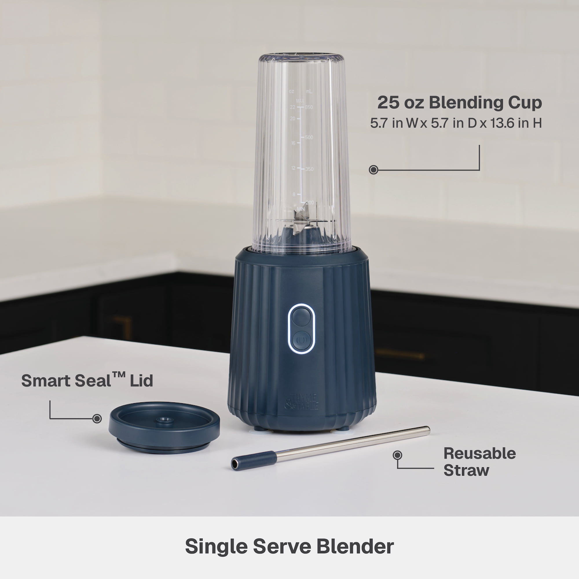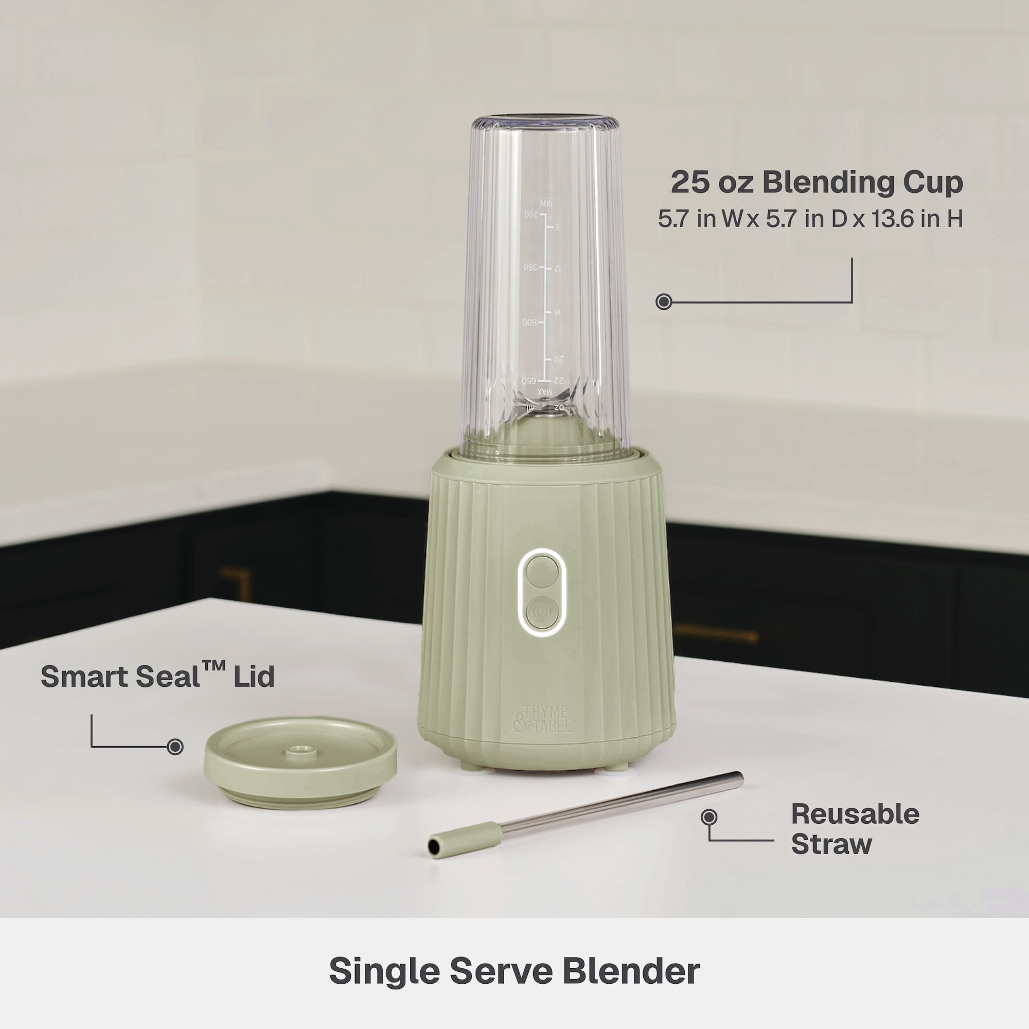 The Thyme & Table Single-Serve Blender is designed for powerful, streamlined blending in a compact, purposeful form. Driven by a high-performance 900-watt motor & a vortex blade system, it delivers smooth, consistent results for smoothies, shakes, sauces, & more. A 6-point stainless steel blade system works together to slice, dice, & crush ice & frozen ingredients with precision for efficient, consistent blending performance. A durable 25 oz Tritan™ blending cup doubles as a to-go tumbler, while the Smart Seal™ lid creates a spill-resistant seal when the straw is removed—making it easy to blend & take drinks with you. With simple controls & thoughtfully engineered details, this single-serve blender offers a refined, everyday blending experience built for modern routines. Two straightforward modes—Blend & Pulse—provide intuitive control for a variety of ingredients & textures.