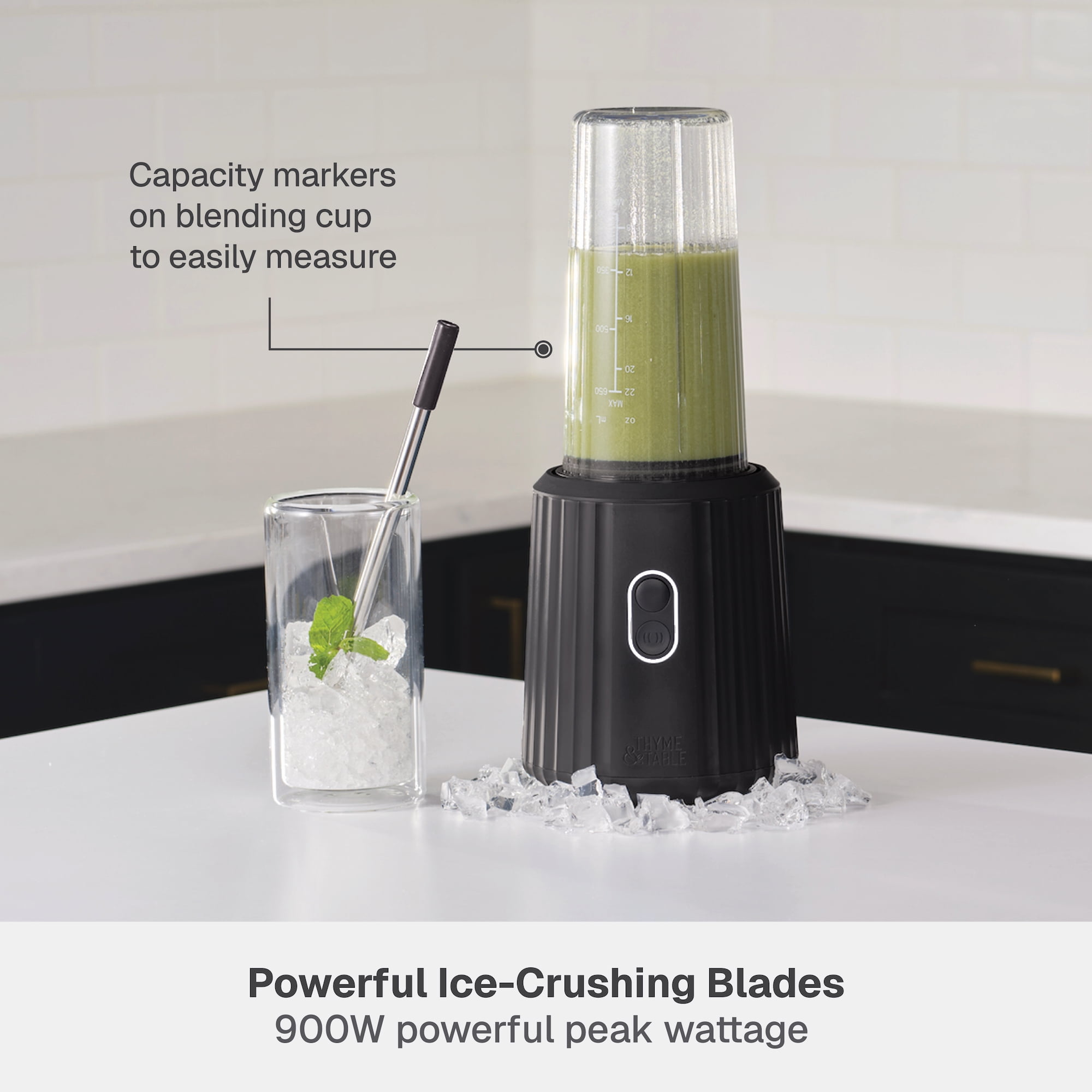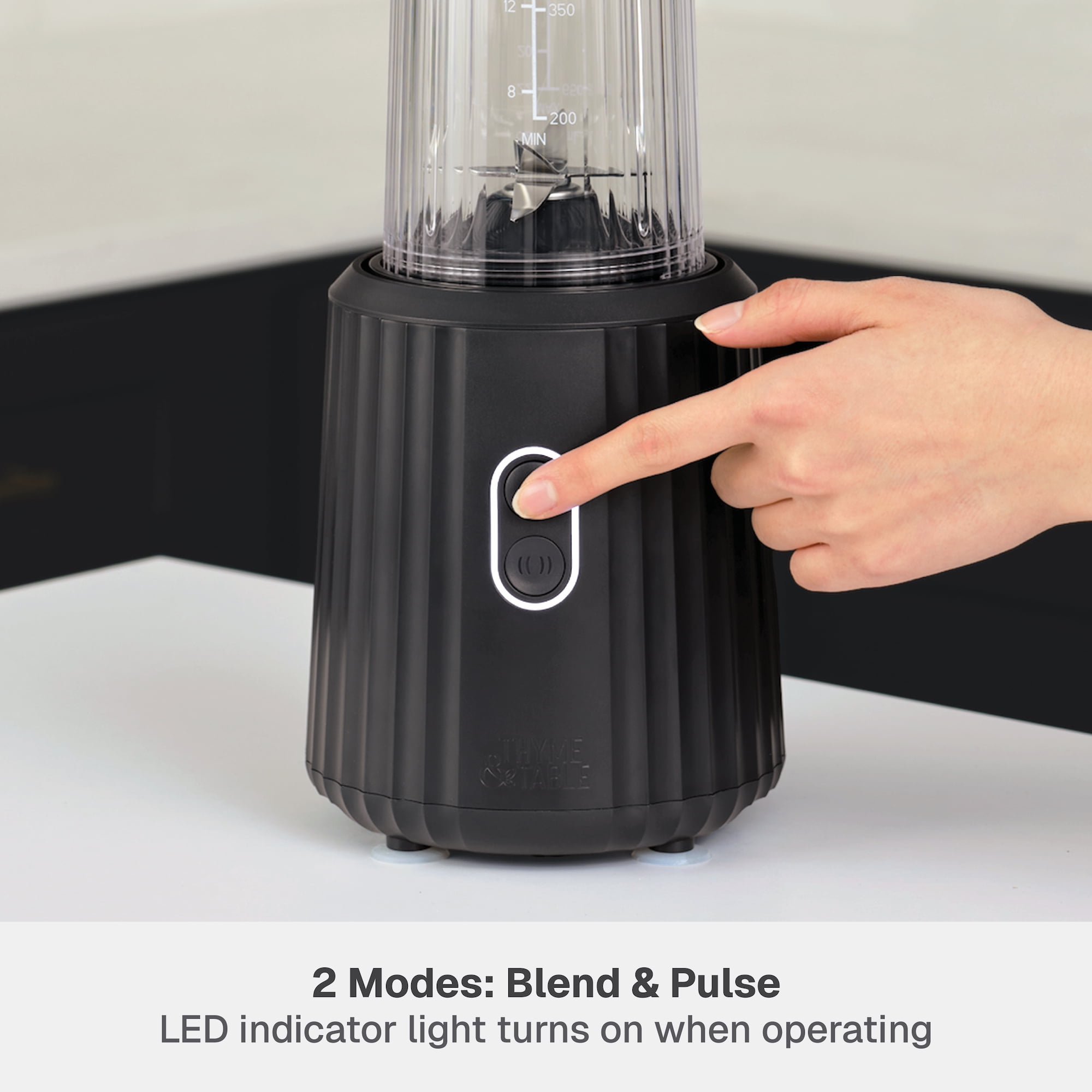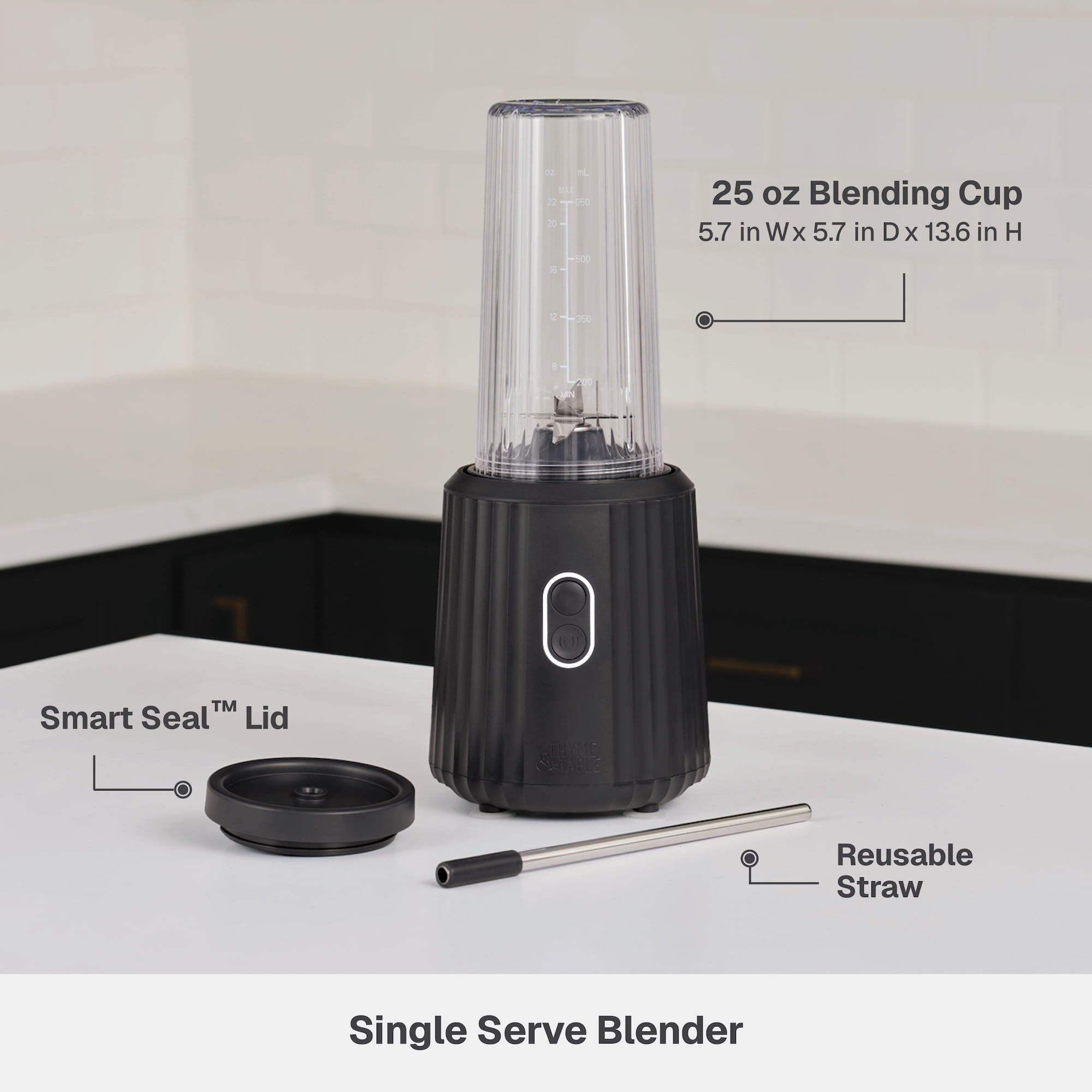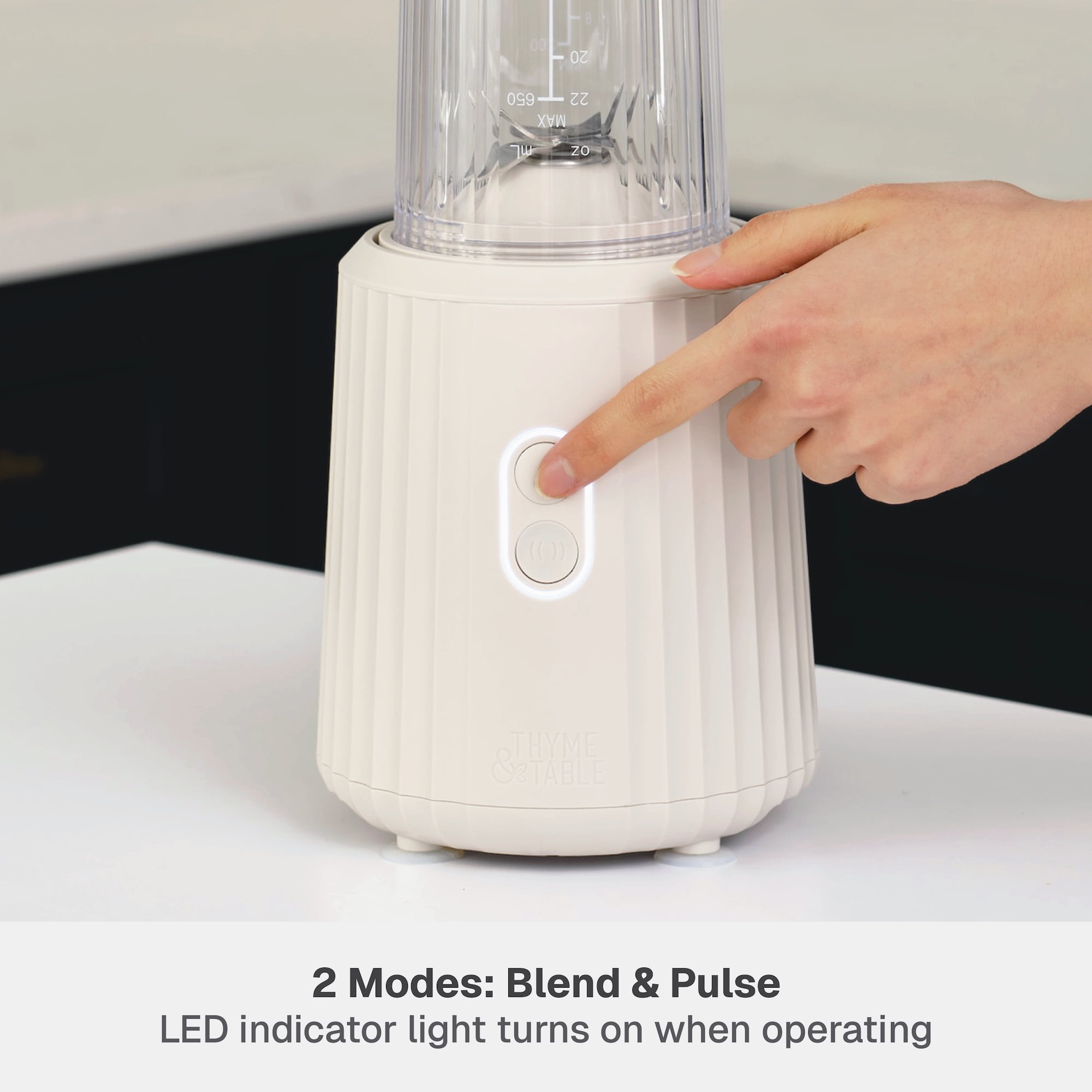 The Thyme & Table Single-Serve Blender is designed for powerful, streamlined blending in a compact, purposeful form. Driven by a high-performance 900-watt motor & a vortex blade system, it delivers smooth, consistent results for smoothies, shakes, sauces, & more. A 6-point stainless steel blade system works together to slice, dice, & crush ice & frozen ingredients with precision for efficient, consistent blending performance. A durable 25 oz Tritan™ blending cup doubles as a to-go tumbler, while the Smart Seal™ lid creates a spill-resistant seal when the straw is removed—making it easy to blend & take drinks with you. With simple controls & thoughtfully engineered details, this single-serve blender offers a refined, everyday blending experience built for modern routines. Two straightforward modes—Blend & Pulse—provide intuitive control for a variety of ingredients & textures.