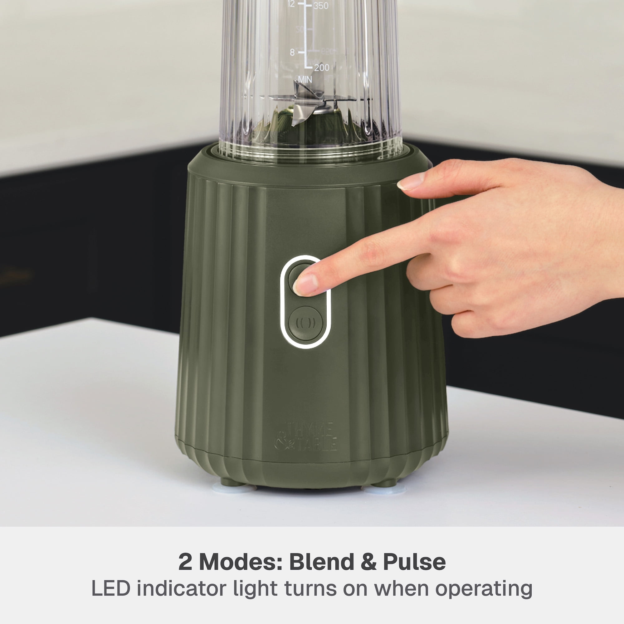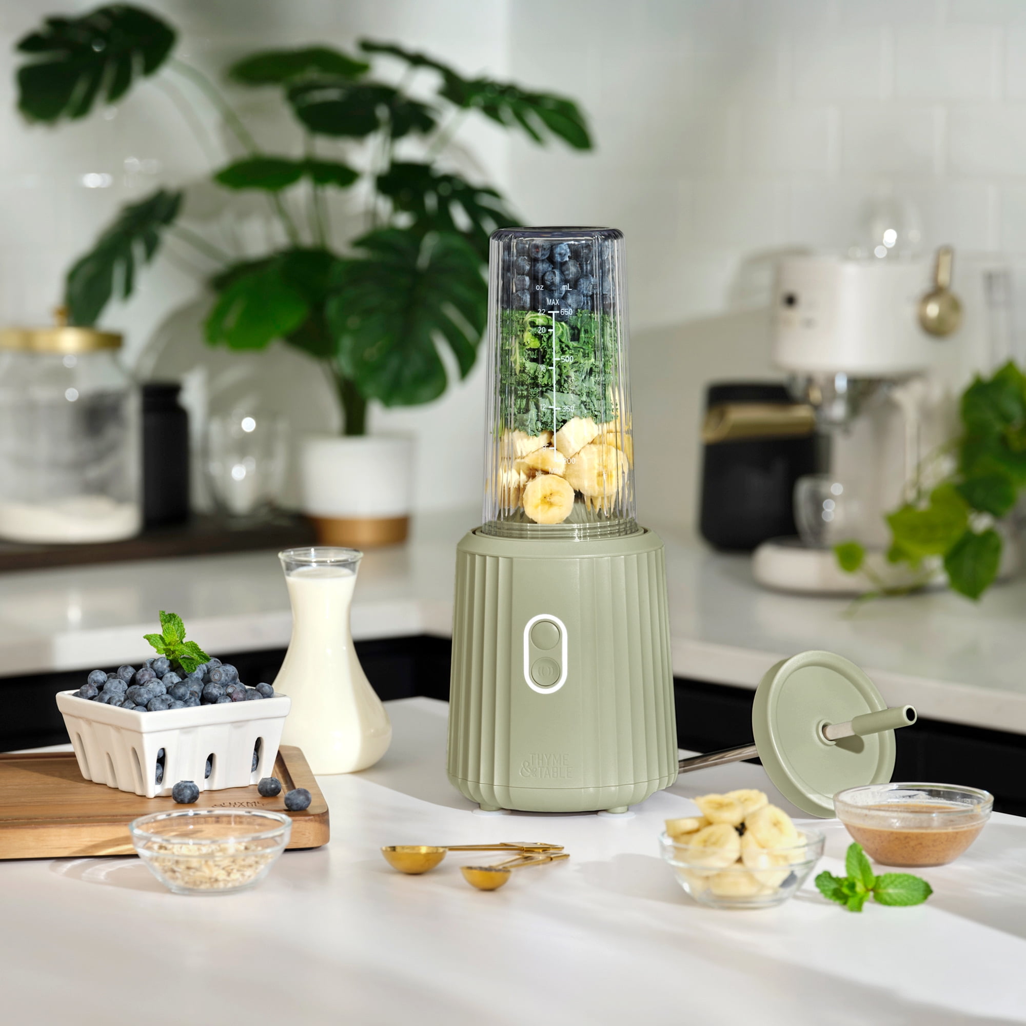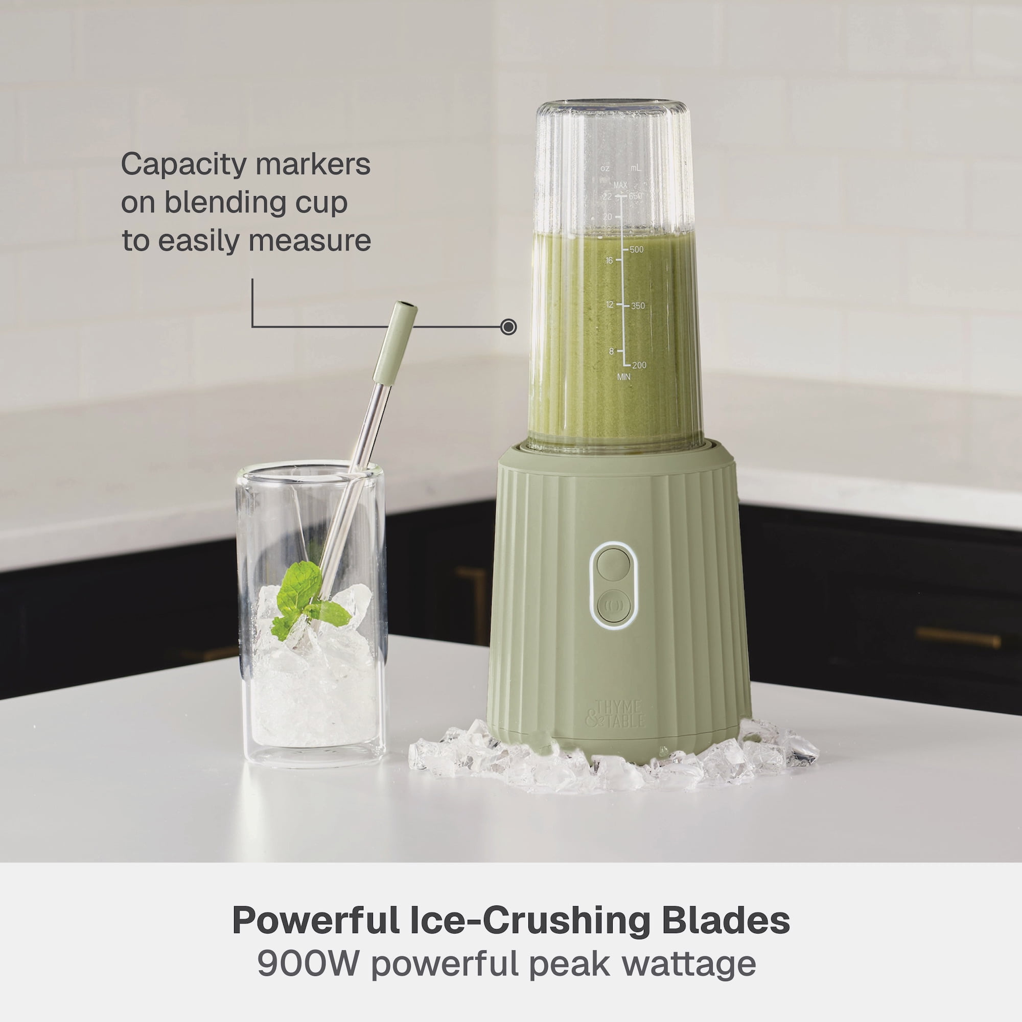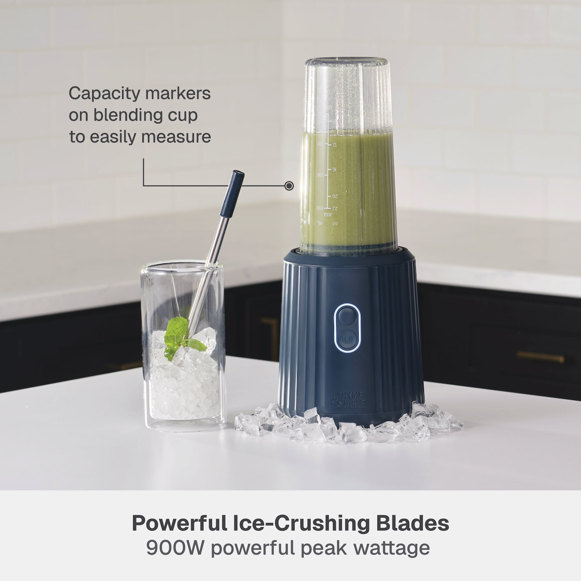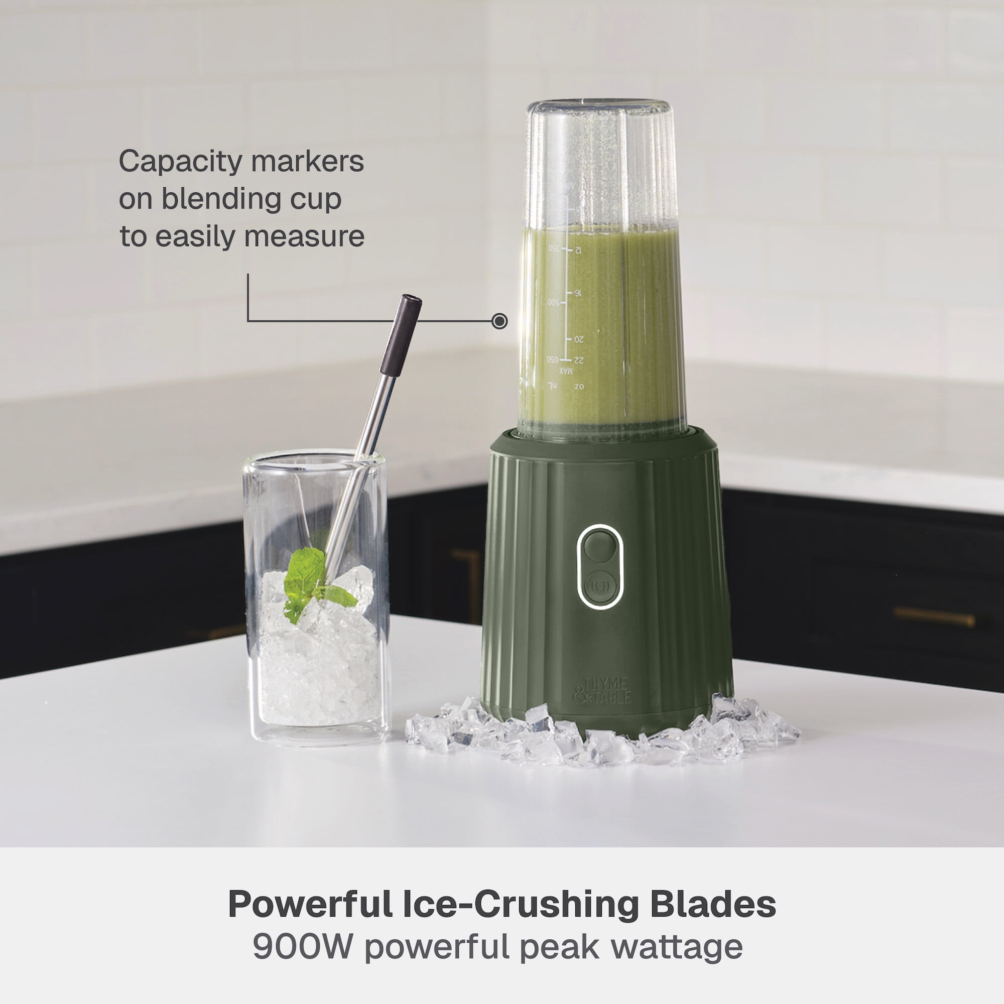 The Thyme & Table Single-Serve Blender is designed for powerful, streamlined blending in a compact, purposeful form. Driven by a high-performance 900-watt motor & a vortex blade system, it delivers smooth, consistent results for smoothies, shakes, sauces, & more. A 6-point stainless steel blade system works together to slice, dice, & crush ice & frozen ingredients with precision for efficient, consistent blending performance. A durable 25 oz Tritan™ blending cup doubles as a to-go tumbler, while the Smart Seal™ lid creates a spill-resistant seal when the straw is removed—making it easy to blend & take drinks with you. With simple controls & thoughtfully engineered details, this single-serve blender offers a refined, everyday blending experience built for modern routines. Two straightforward modes—Blend & Pulse—provide intuitive control for a variety of ingredients & textures.