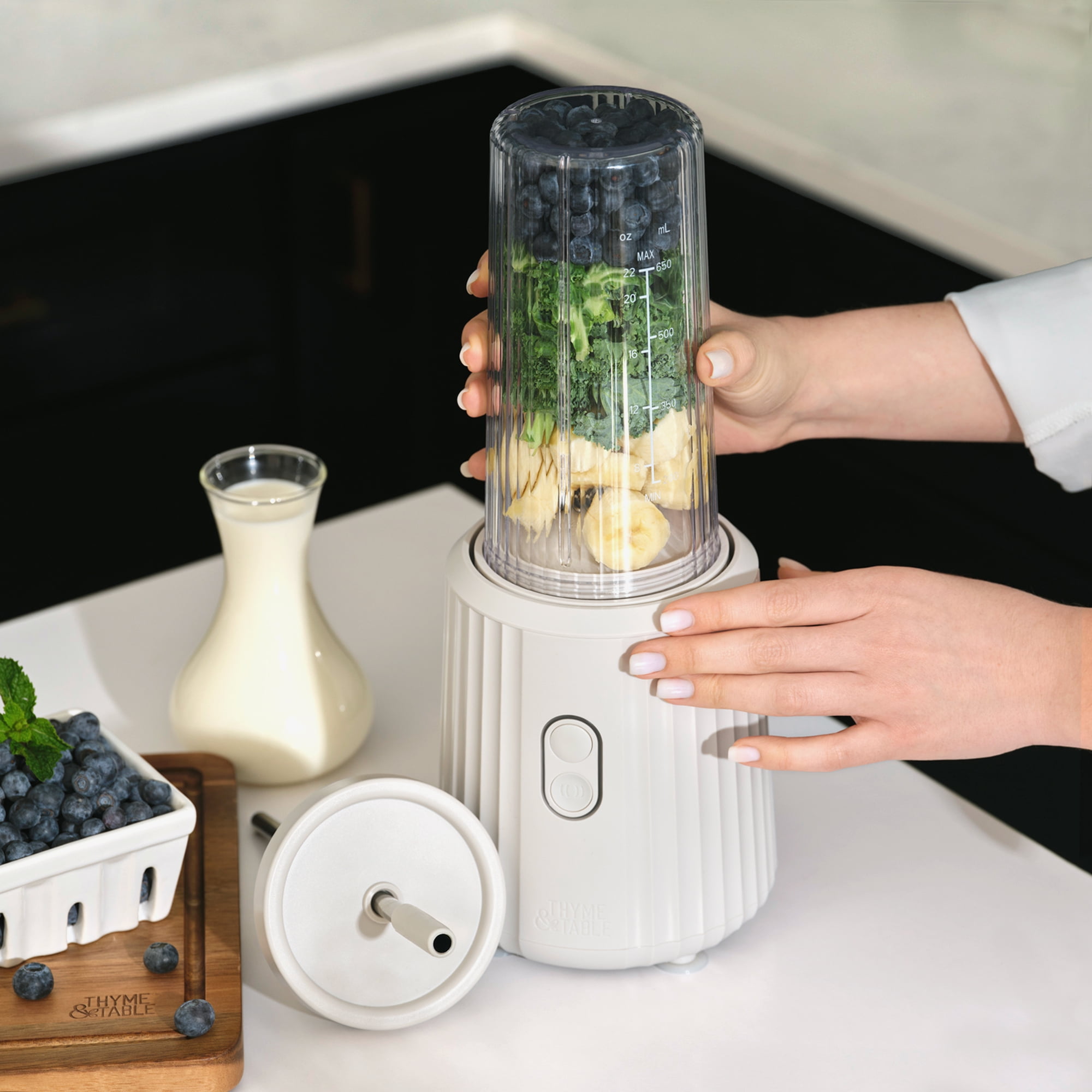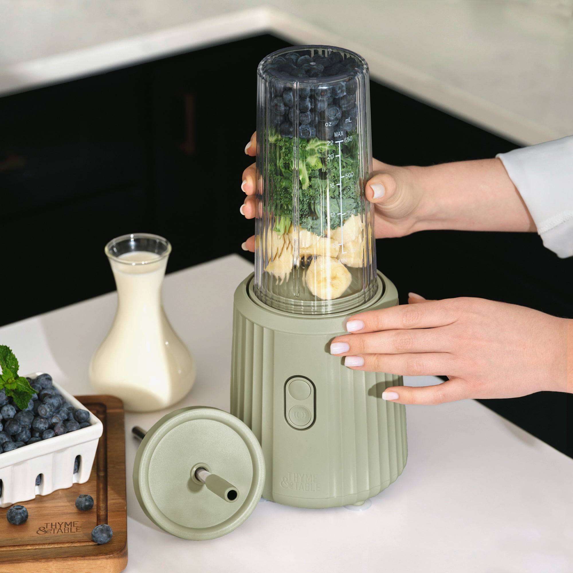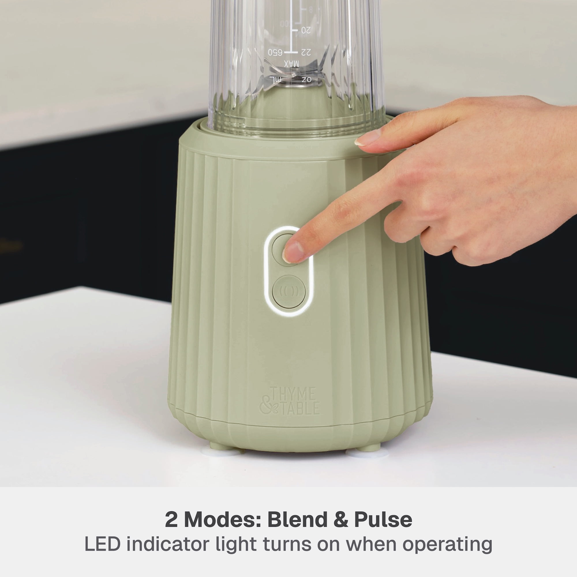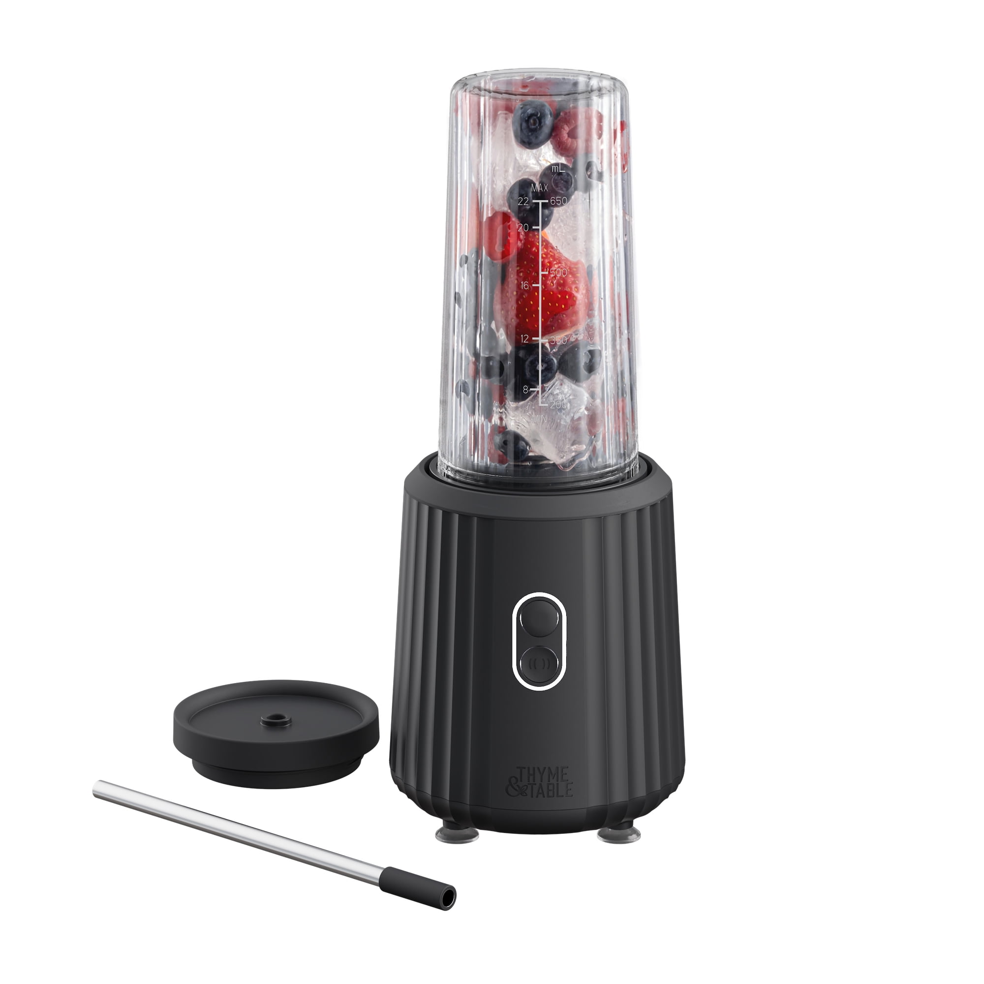 The Thyme & Table Single-Serve Blender is designed for powerful, streamlined blending in a compact, purposeful form. Driven by a high-performance 900-watt motor & a vortex blade system, it delivers smooth, consistent results for smoothies, shakes, sauces, & more. A 6-point stainless steel blade system works together to slice, dice, & crush ice & frozen ingredients with precision for efficient, consistent blending performance. A durable 25 oz Tritan™ blending cup doubles as a to-go tumbler, while the Smart Seal™ lid creates a spill-resistant seal when the straw is removed—making it easy to blend & take drinks with you. With simple controls & thoughtfully engineered details, this single-serve blender offers a refined, everyday blending experience built for modern routines. Two straightforward modes—Blend & Pulse—provide intuitive control for a variety of ingredients & textures.