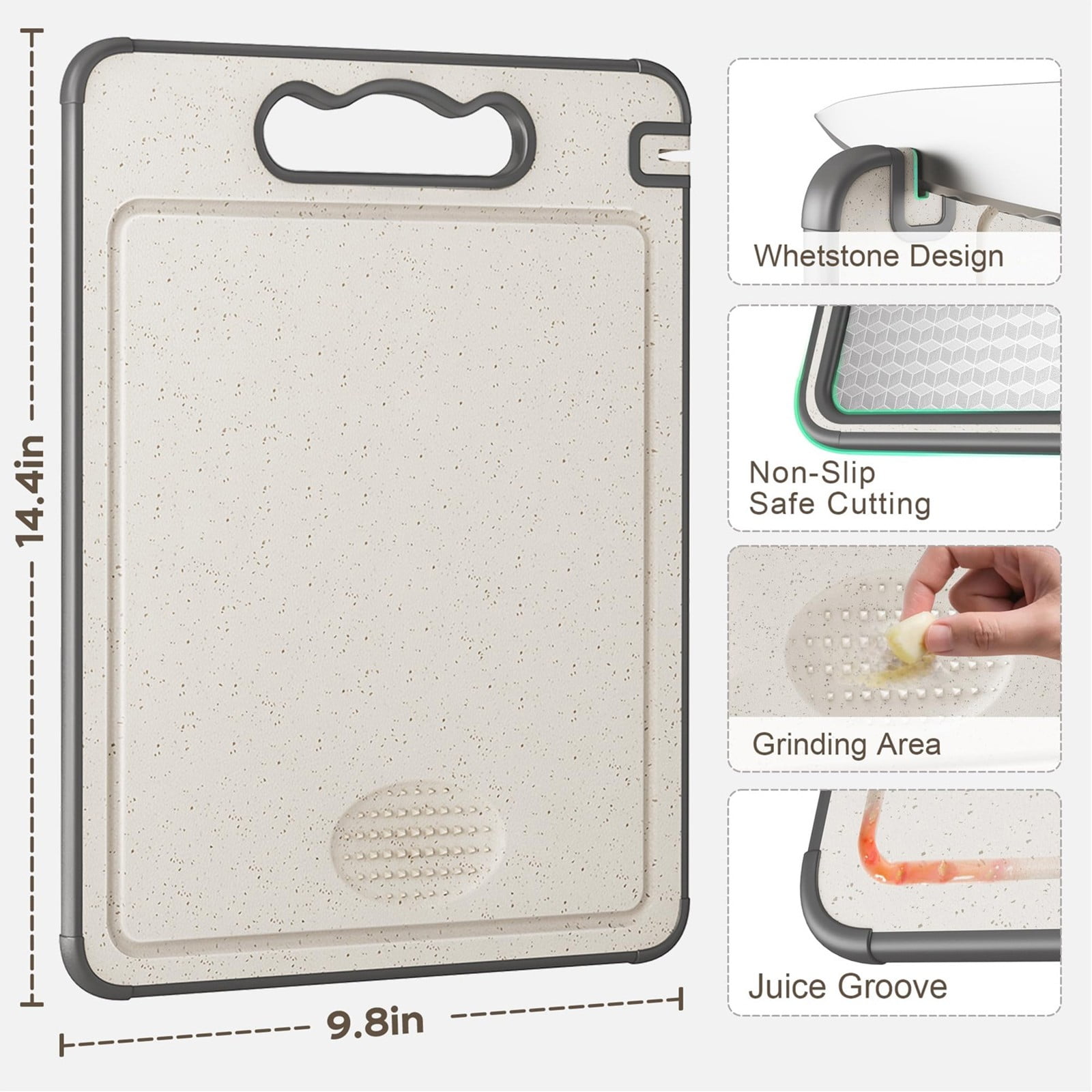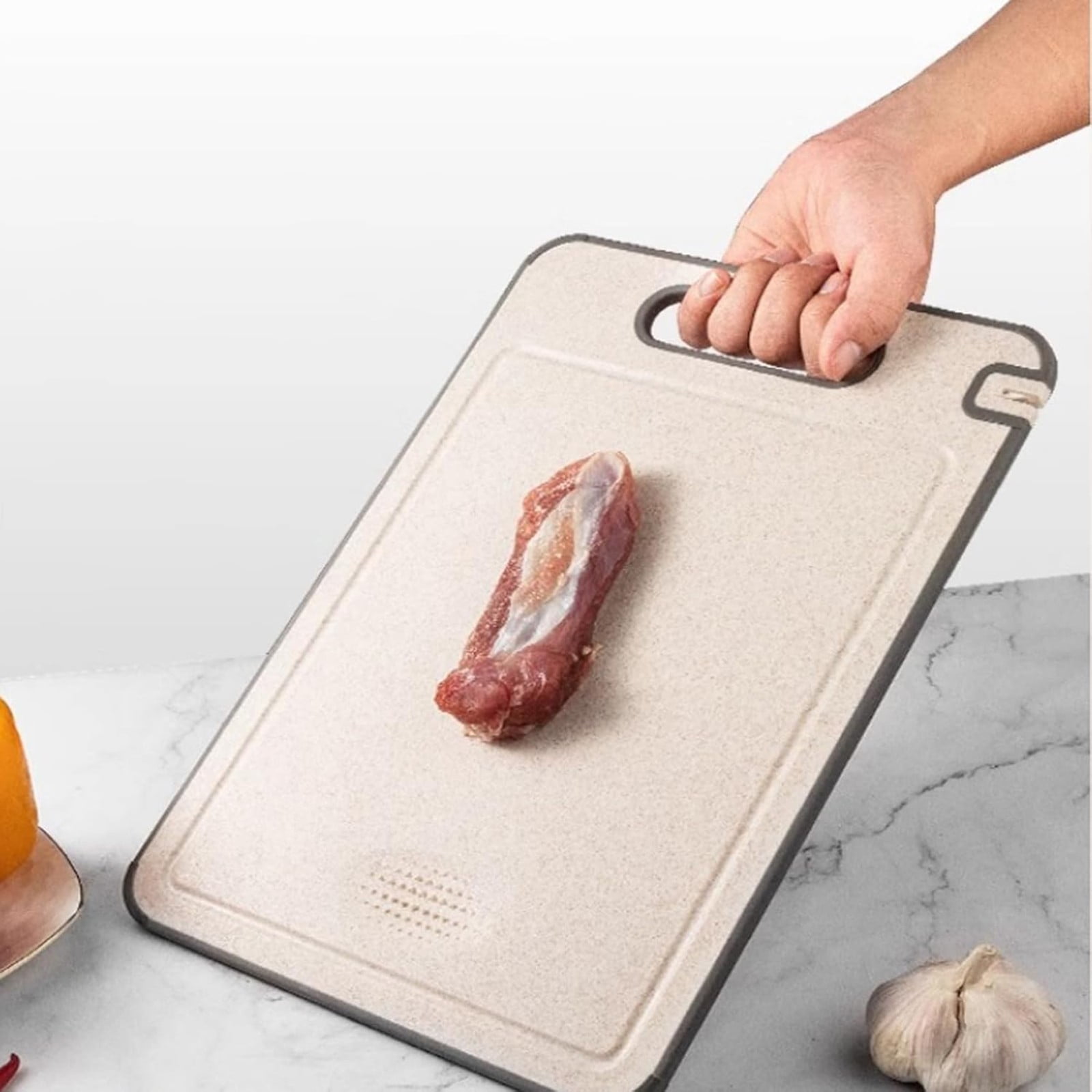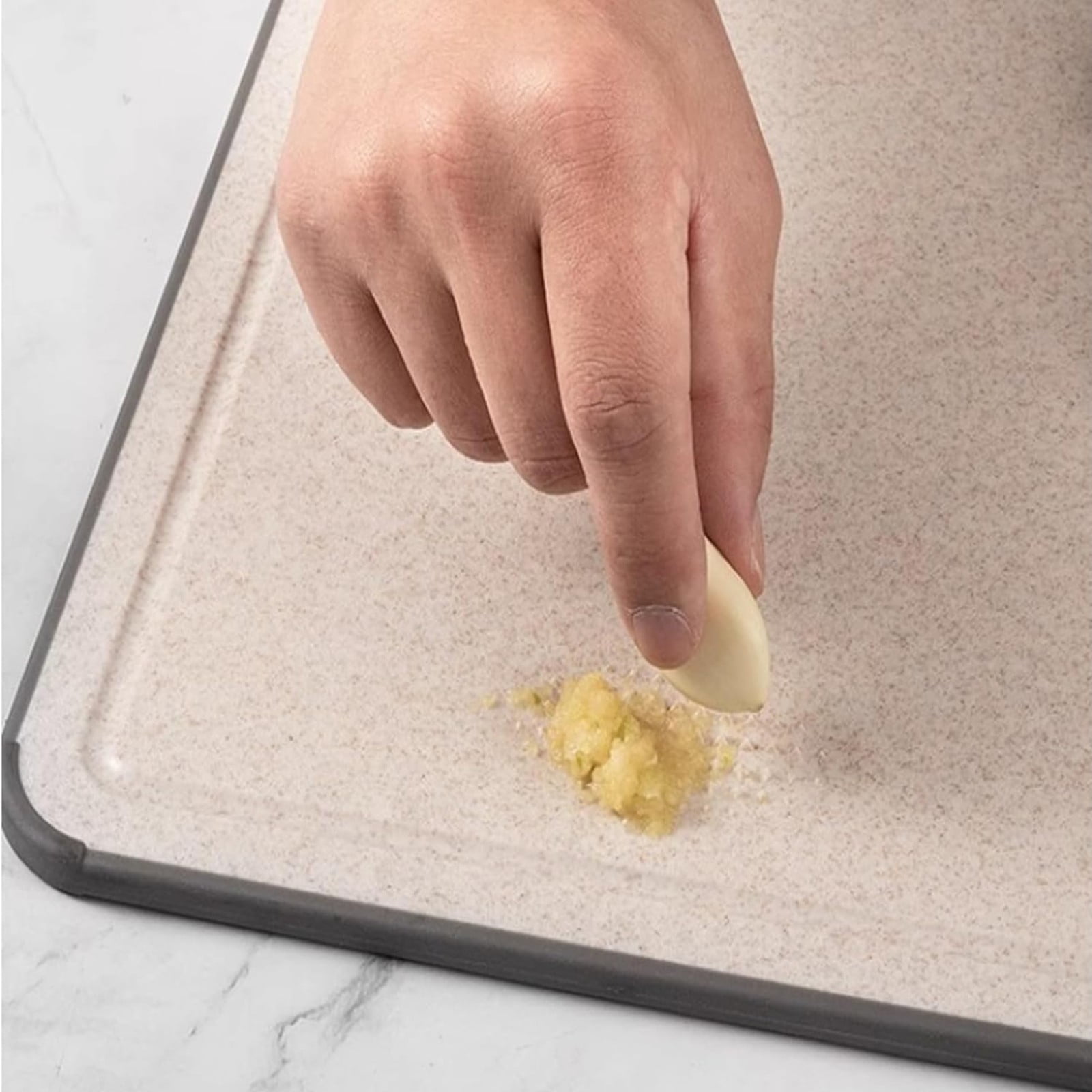 • 【Dual-Sided Design with Garlic & Ginger Grater】Use the titanium side for meats and proteins, then flip to the straw-fiber side for fruits and vegetables. The built-in grater makes quick work of garlic, ginger, and spices—no extra tools needed