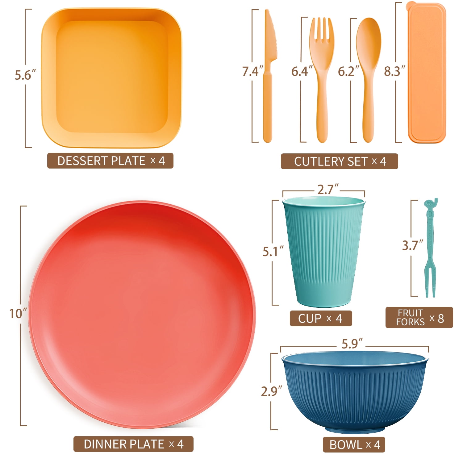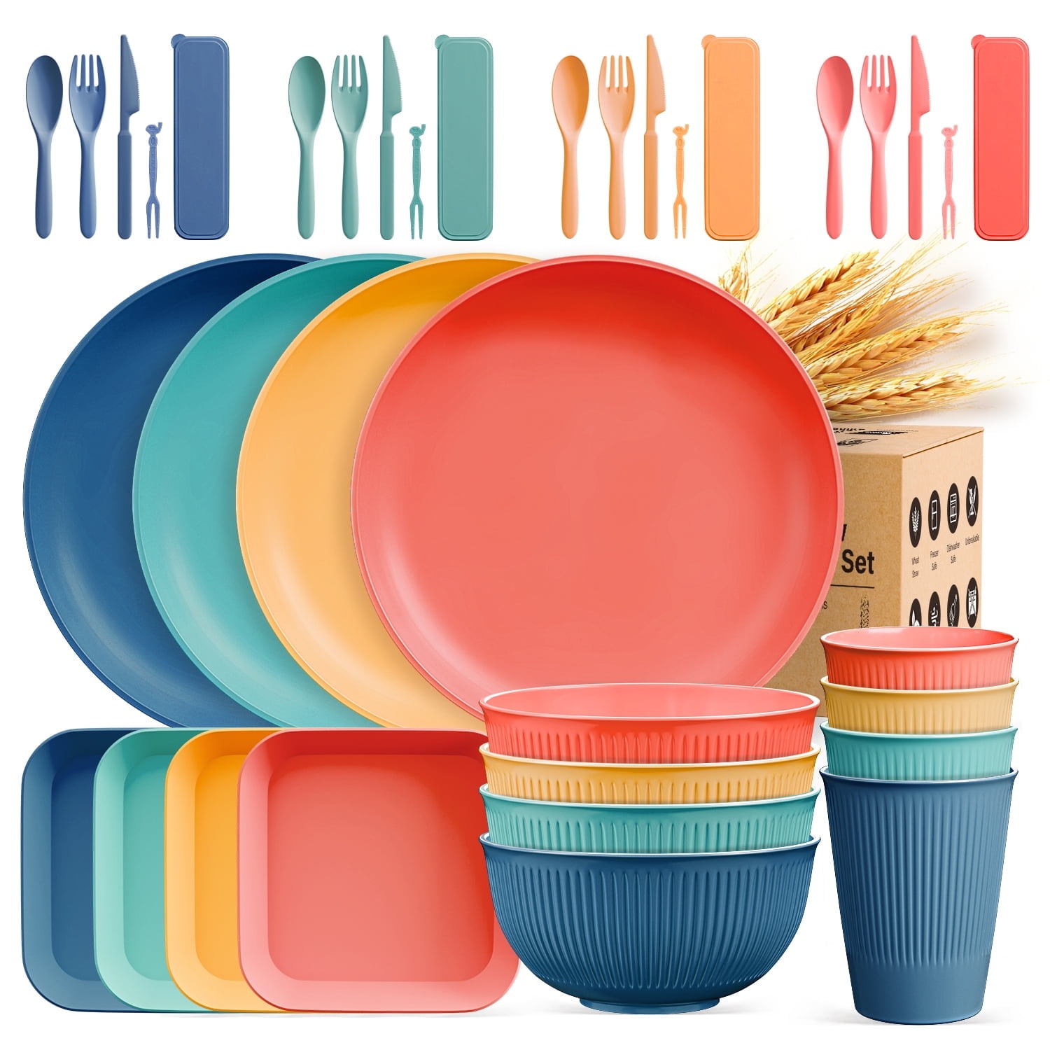 TINANA Wheat Straw Dinnerware Set, Service for 4, 36 PCS Unbreakable Plastic Plates and Bowls Sets, Dishwasher Microwave Safe – Multi Color