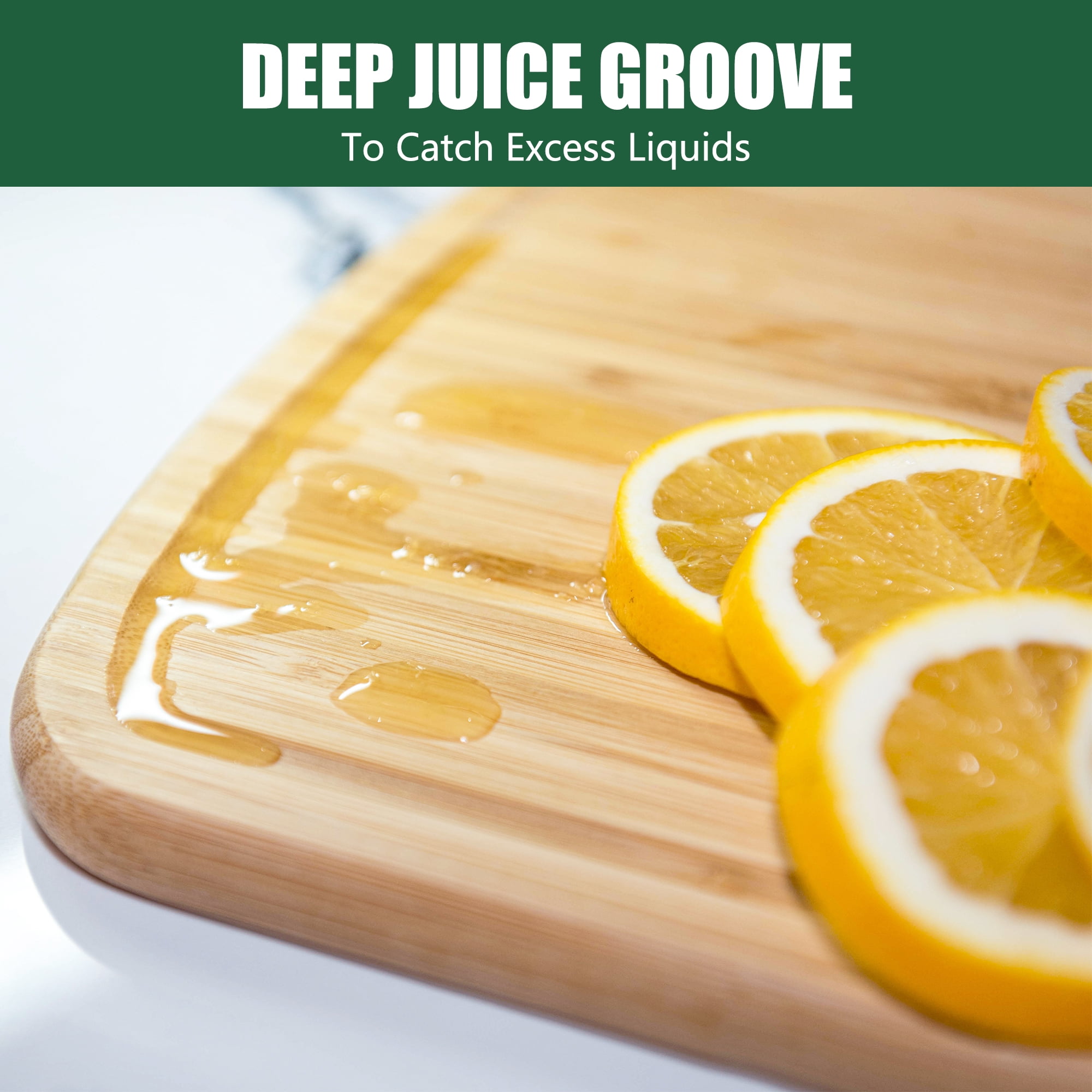 BUILD-IN GROOVE – NO MESS, NO STRESS! Each board features a deep juice groove that captures excess liquids, preventing spillage and keeping your kitchen counter neat and tidy.